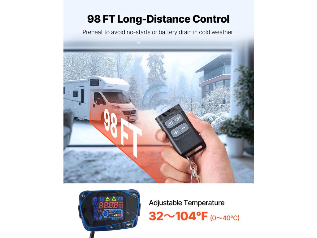 Naše parkovací naftové topení je dodáváno s dálkovým ovládáním s dosahem 98 stop, které umožňuje upravovat nastavení a využívat teplo na dálku. Svůj komfort můžete ovládat, aniž byste museli opustit své místo, a LCD displej zajišťuje přehledné a uživatelsky přívětivé rozhraní.