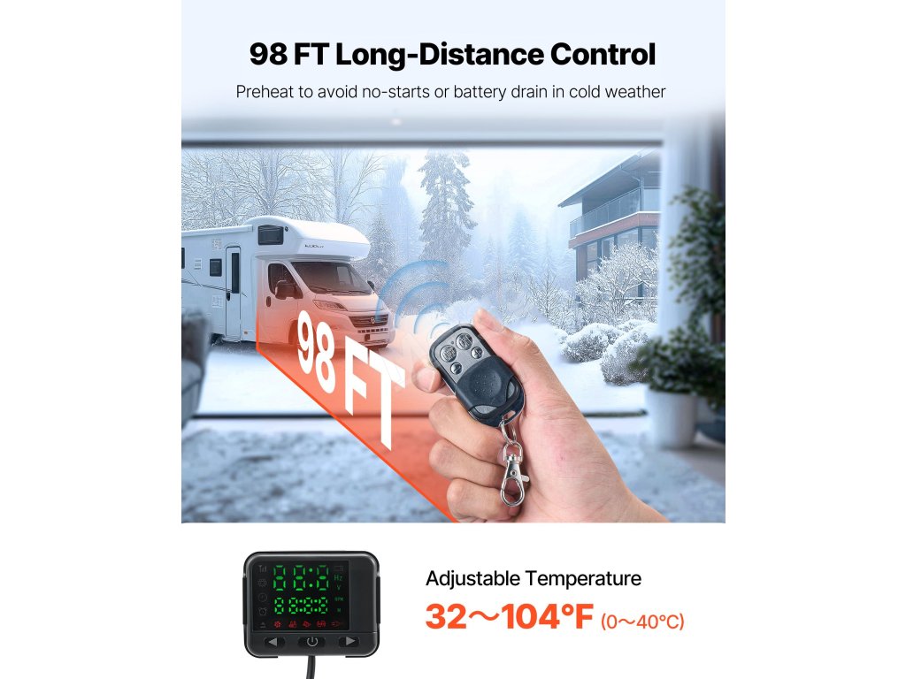Naše parkovací naftové topení je dodáváno s dálkovým ovládáním s dosahem 98 stop, které umožňuje upravovat nastavení a využívat teplo na dálku. Svůj komfort můžete ovládat, aniž byste museli opustit své místo, a LCD displej zajišťuje přehledné a uživatelsky přívětivé rozhraní.