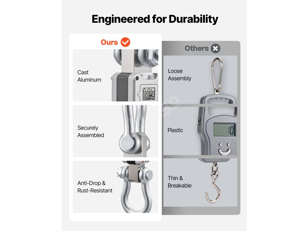 Tato průmyslová závěsná váha je vybavena silnou pozinkovanou ocelovou smyčkou, která je pevně uchycena a odolává ohýbání a korozi. Pevná konstrukce pomáhá zabránit rozpojení a udržuje zdvihy stabilní a bezpečné. Pracujte s důvěrou!