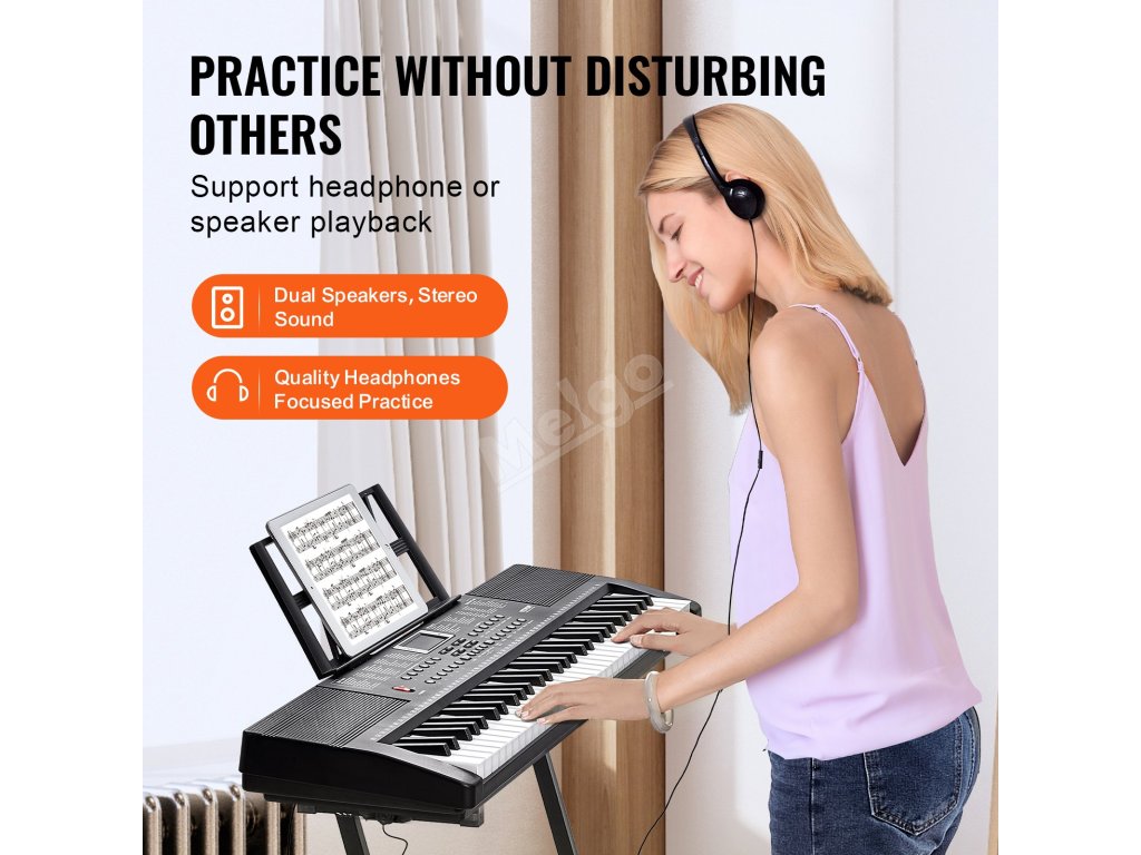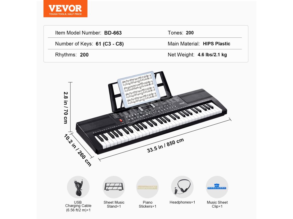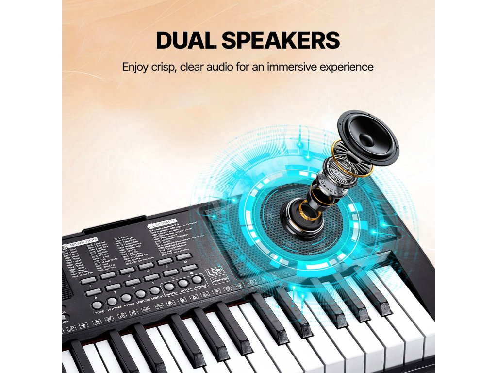 Zlepšete své hudební cvičení s naším 61klávesovým pianem, které je navrženo tak, aby poskytovalo autentický pocit klavíru ideální pro začátečníky. Vychutnejte si bohatý zvukový zážitek díky 200 notám, 200 rytmům, 60 demo skladbám a vestavěným duálním reproduktorům. Sluchátka usnadňují tiché cvičení!