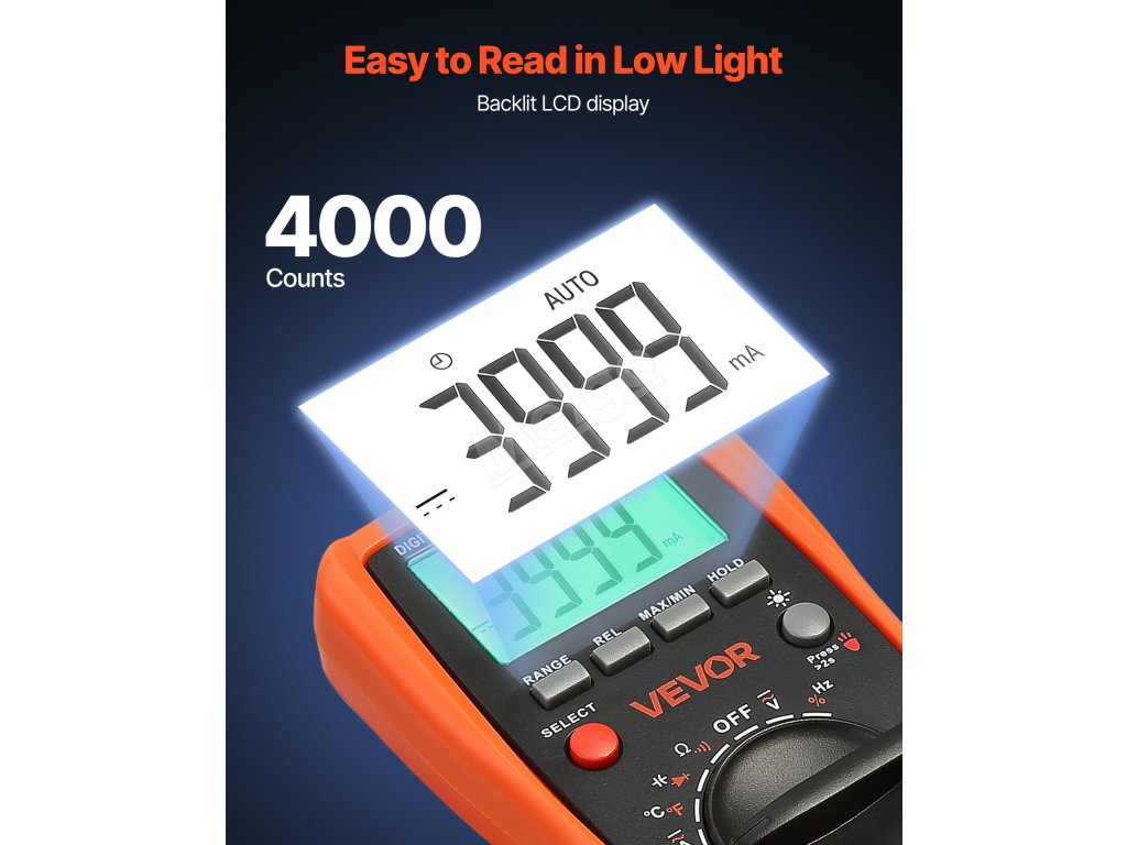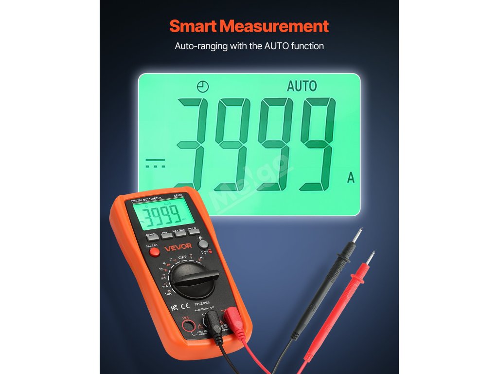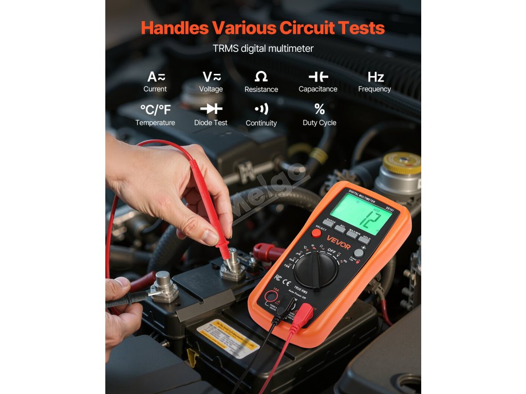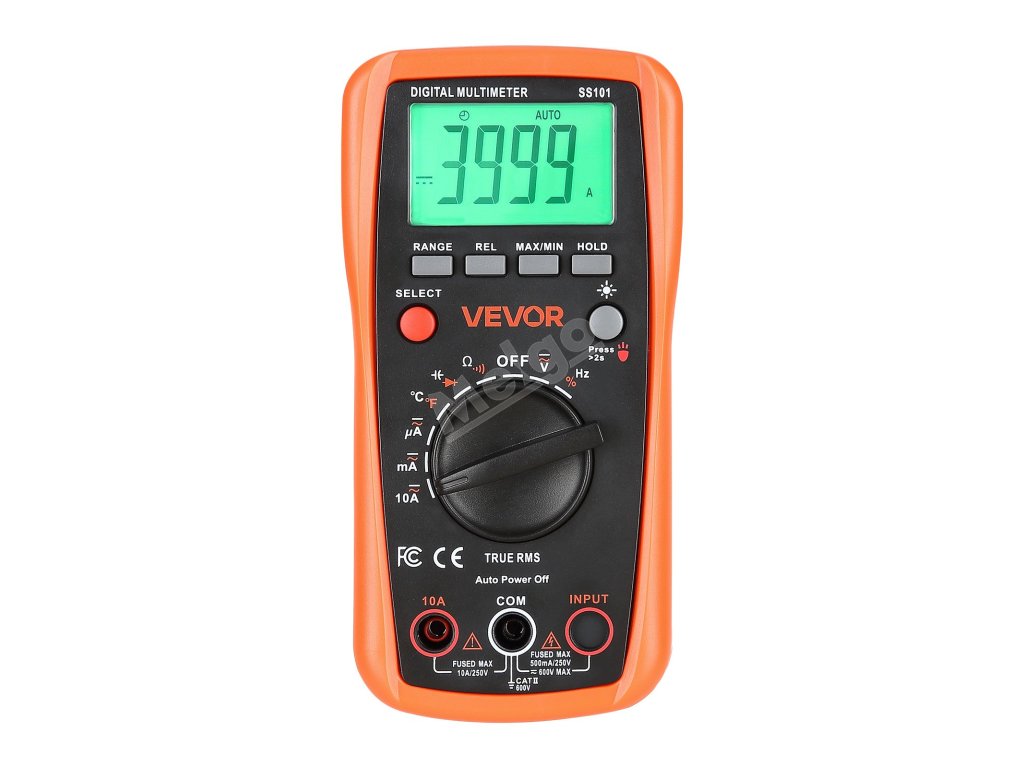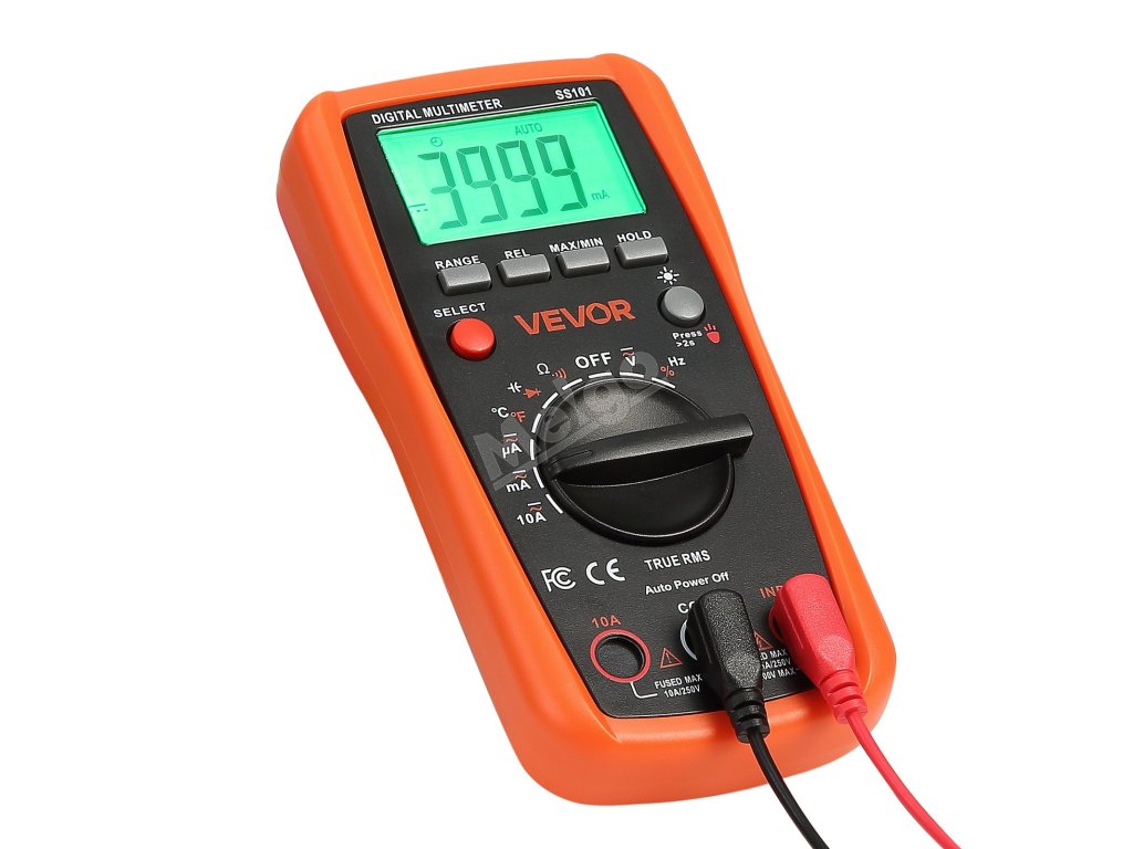 Digitální multimetr VEVOR 4000 TRMS podporuje testování proudu, napětí, odporu, kapacity, frekvence, teploty, diod, spojitosti a pracovního cyklu. Díky technologiím Auto Ranging a True RMS dokáže přesně měřit skutečnou efektivní hodnotu nesinusových průběhů.