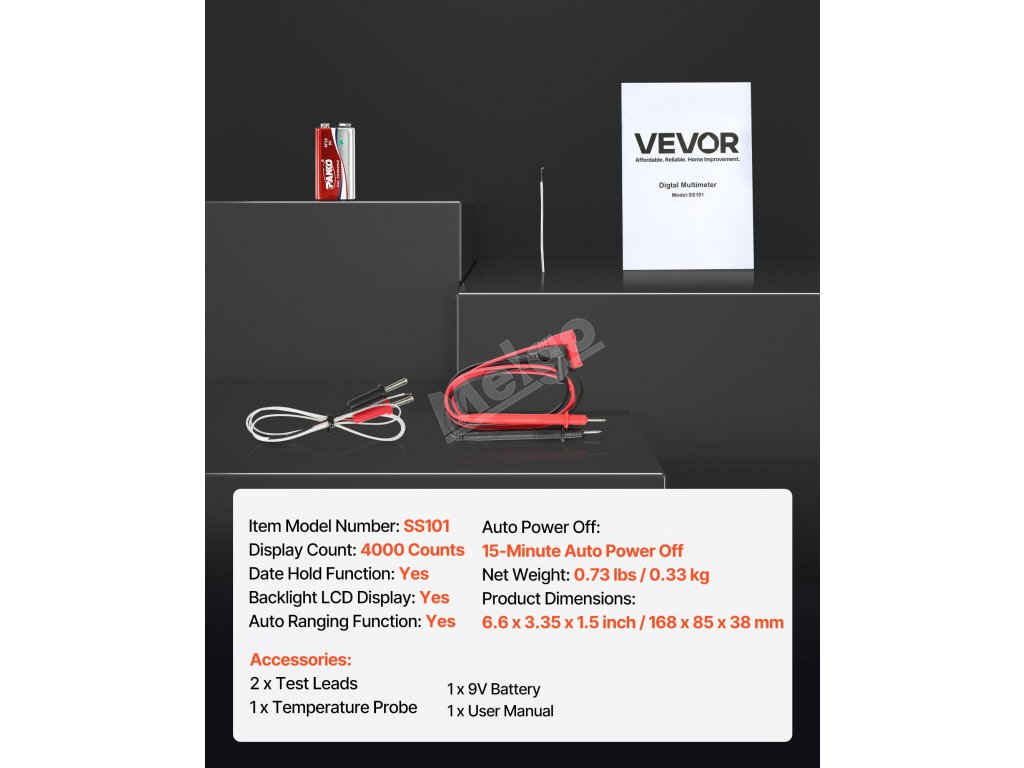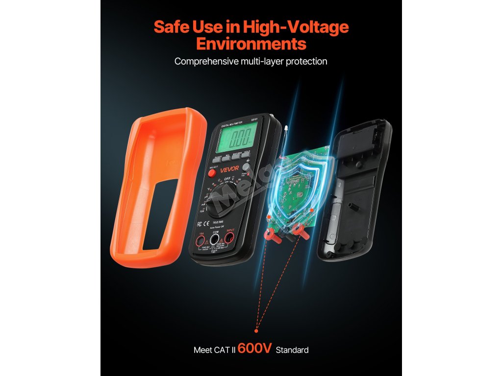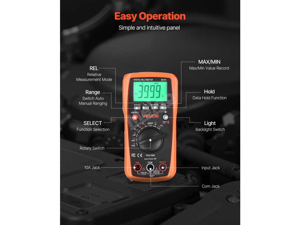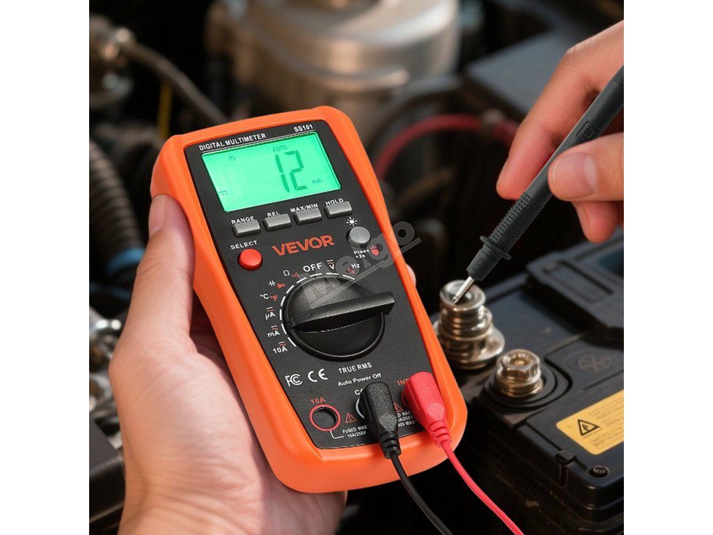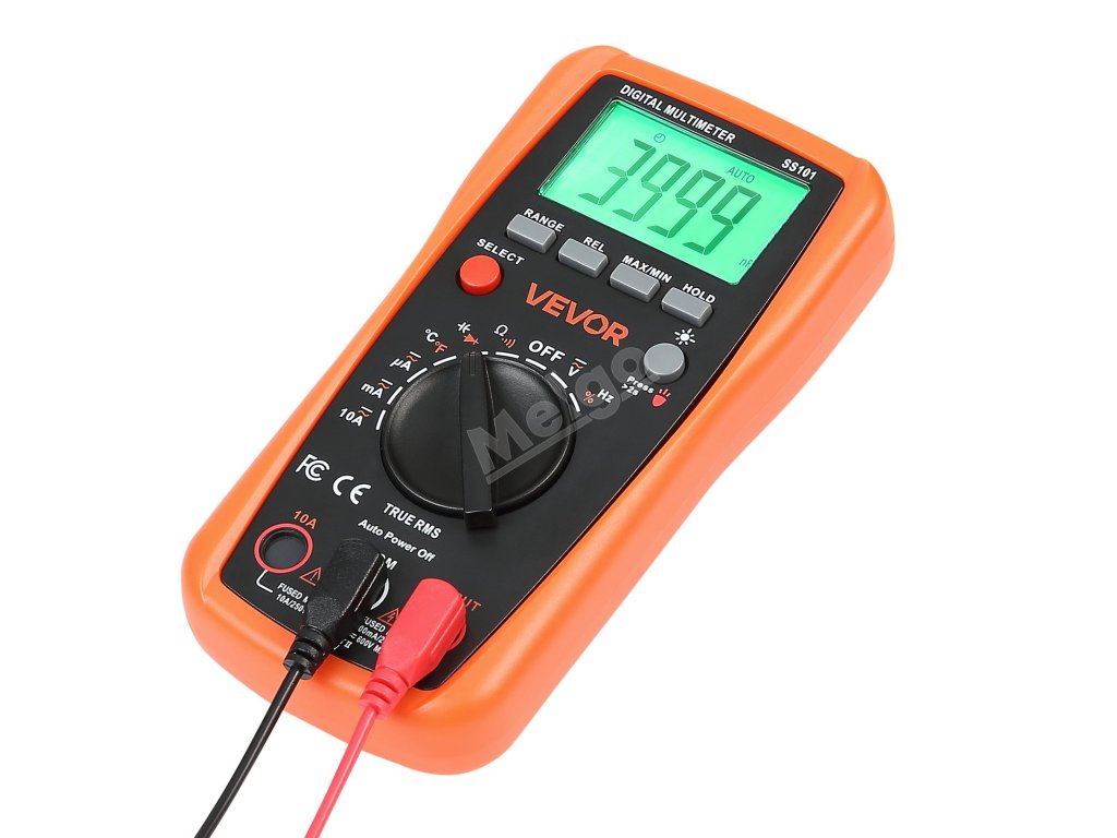 Digitální multimetr VEVOR 4000 TRMS podporuje testování proudu, napětí, odporu, kapacity, frekvence, teploty, diod, spojitosti a pracovního cyklu. Díky technologiím Auto Ranging a True RMS dokáže přesně měřit skutečnou efektivní hodnotu nesinusových průběhů.