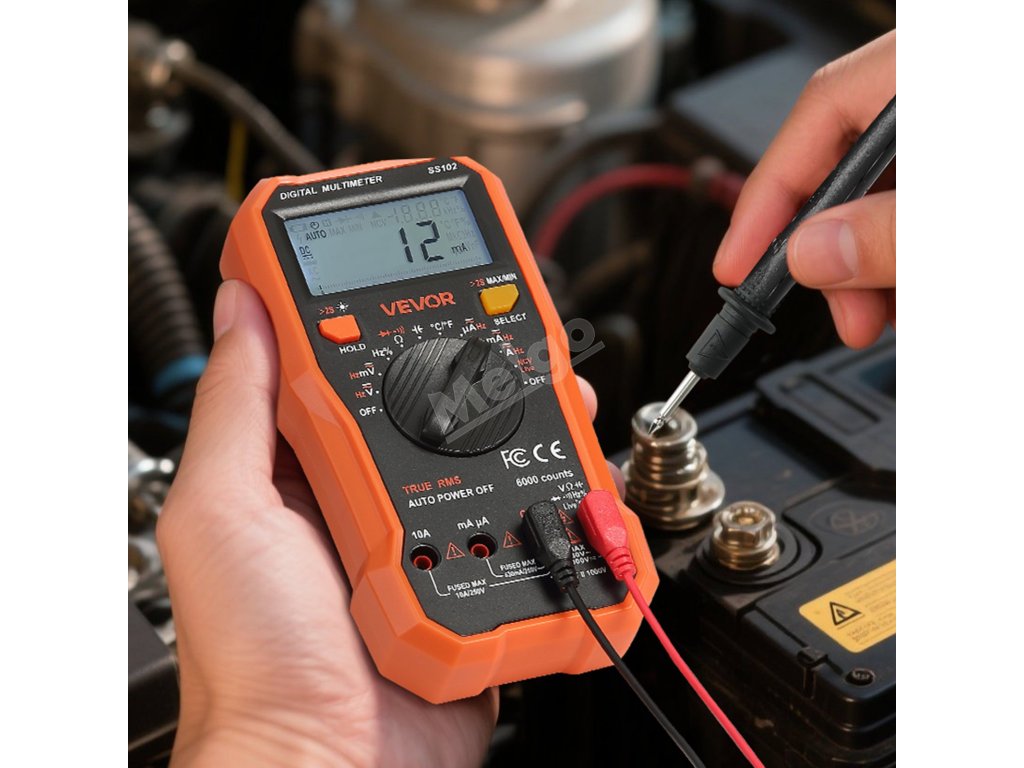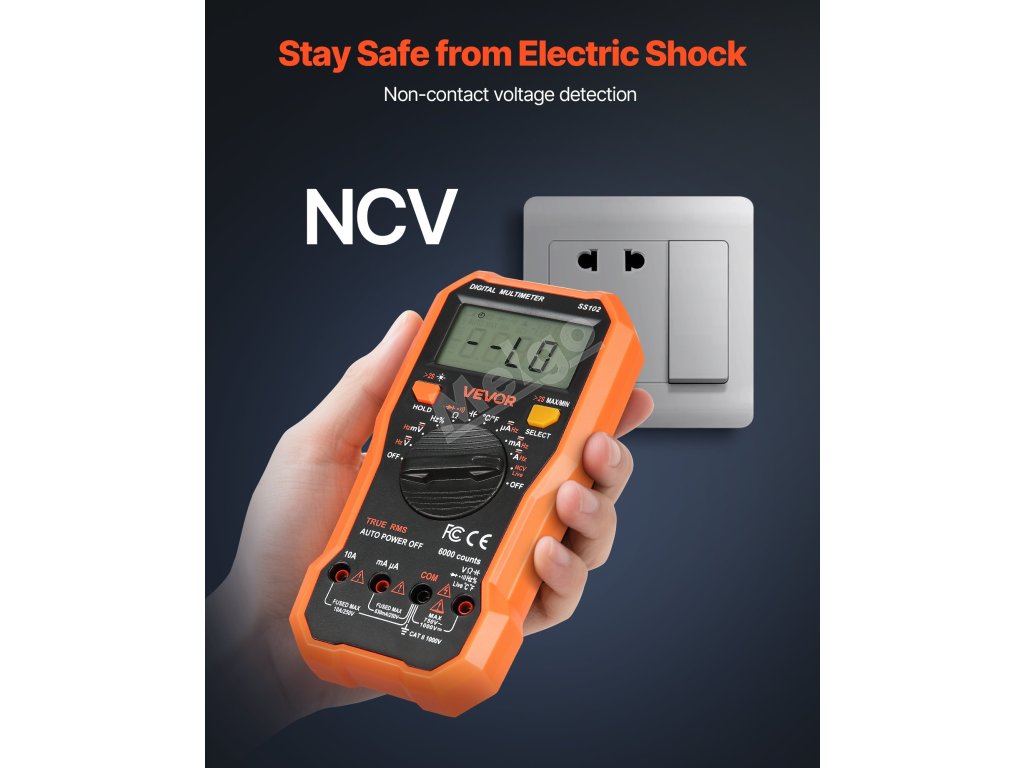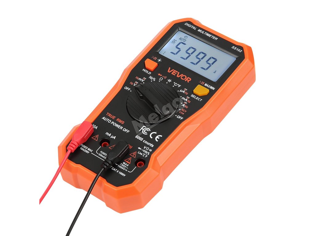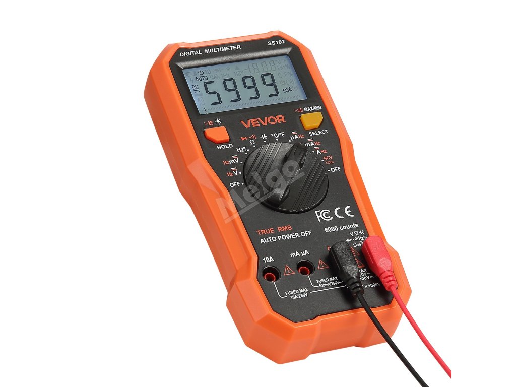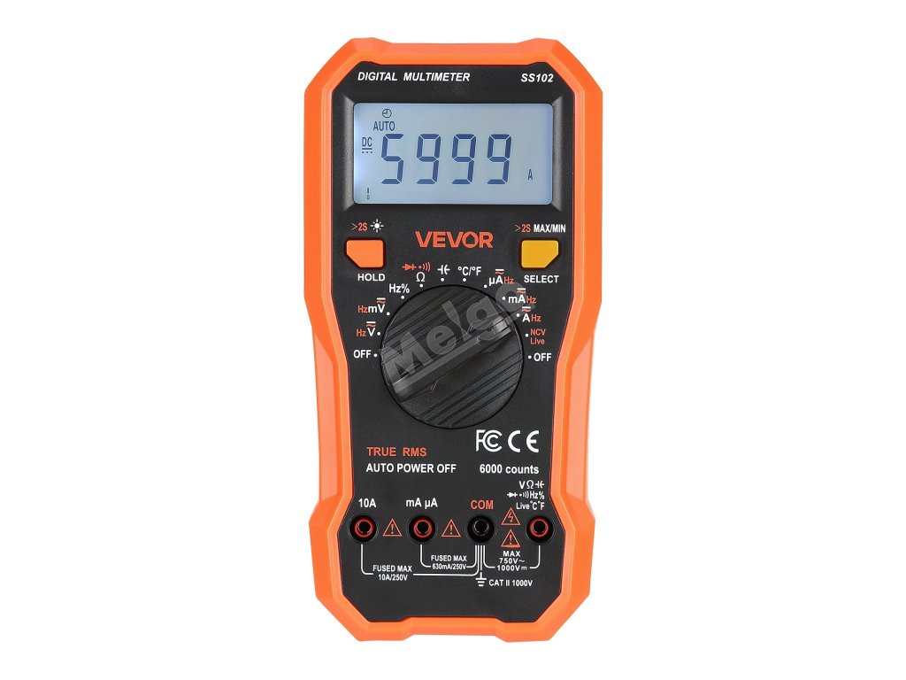 Digitální multimetr VEVOR 6000 s TRMS podporuje testování proudu, napětí, odporu, kapacity, frekvence, teploty, diod, spojitosti a pracovního cyklu. Díky technologii bezkontaktní detekce napětí (NCV) True RMS poskytuje přesnější, profesionálnější a bezpečnější elektrická měření.