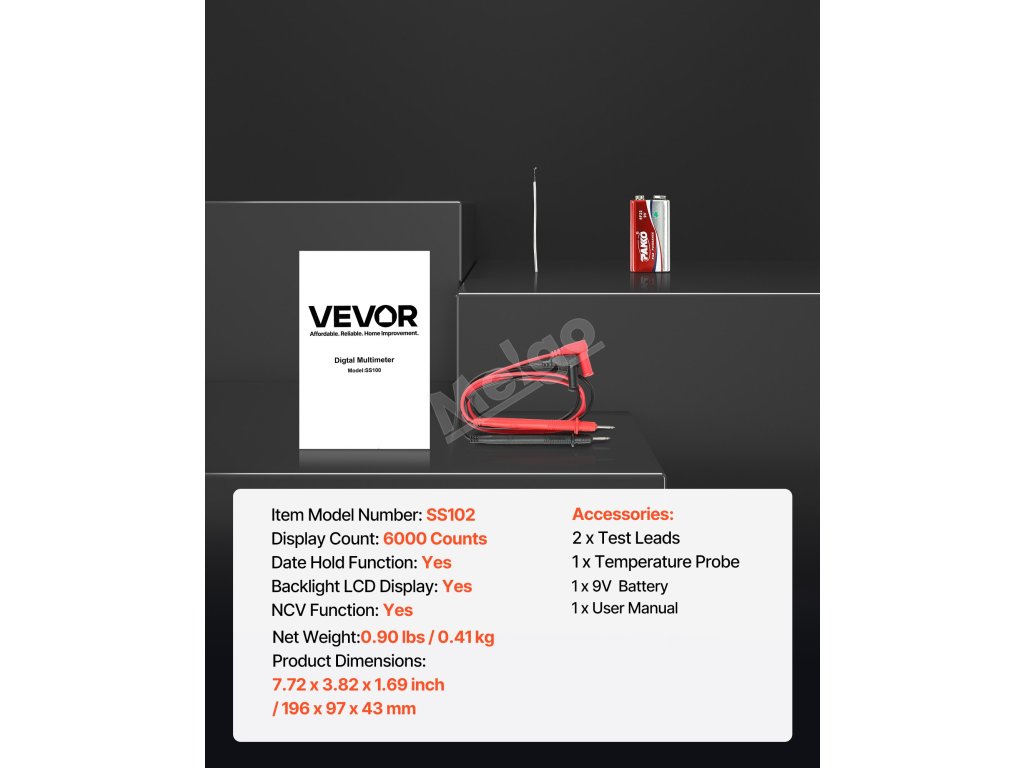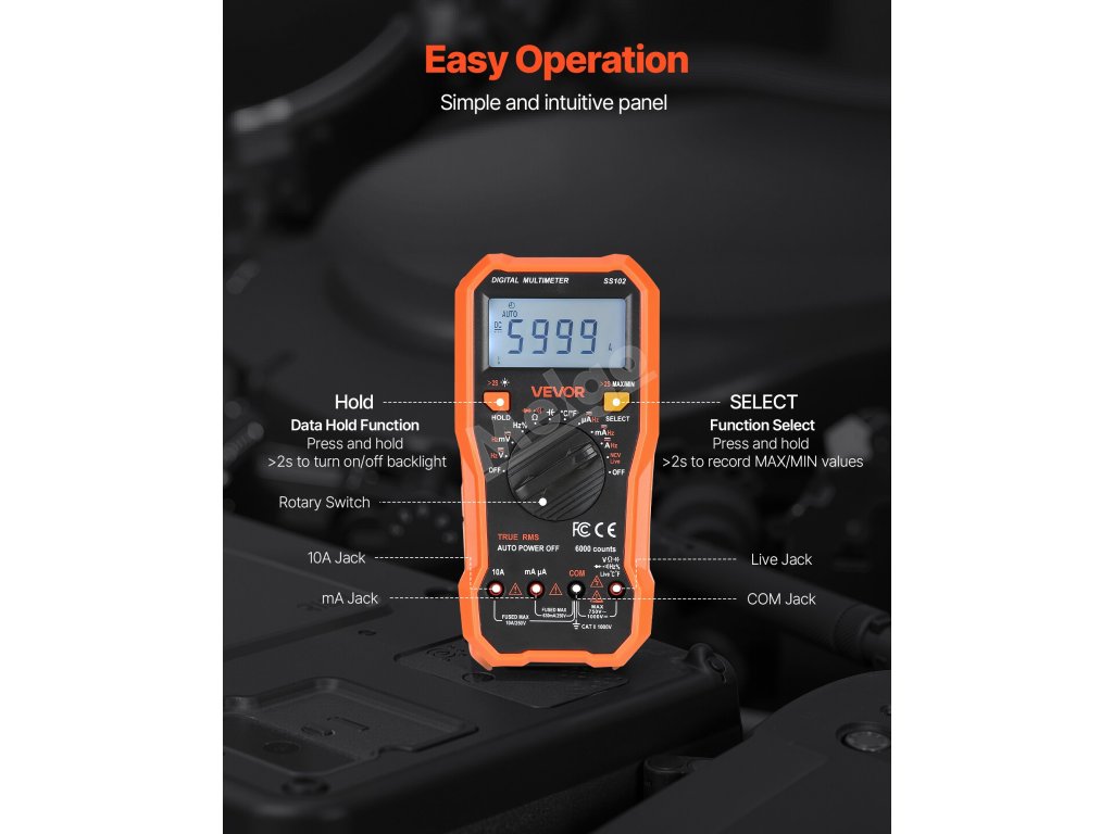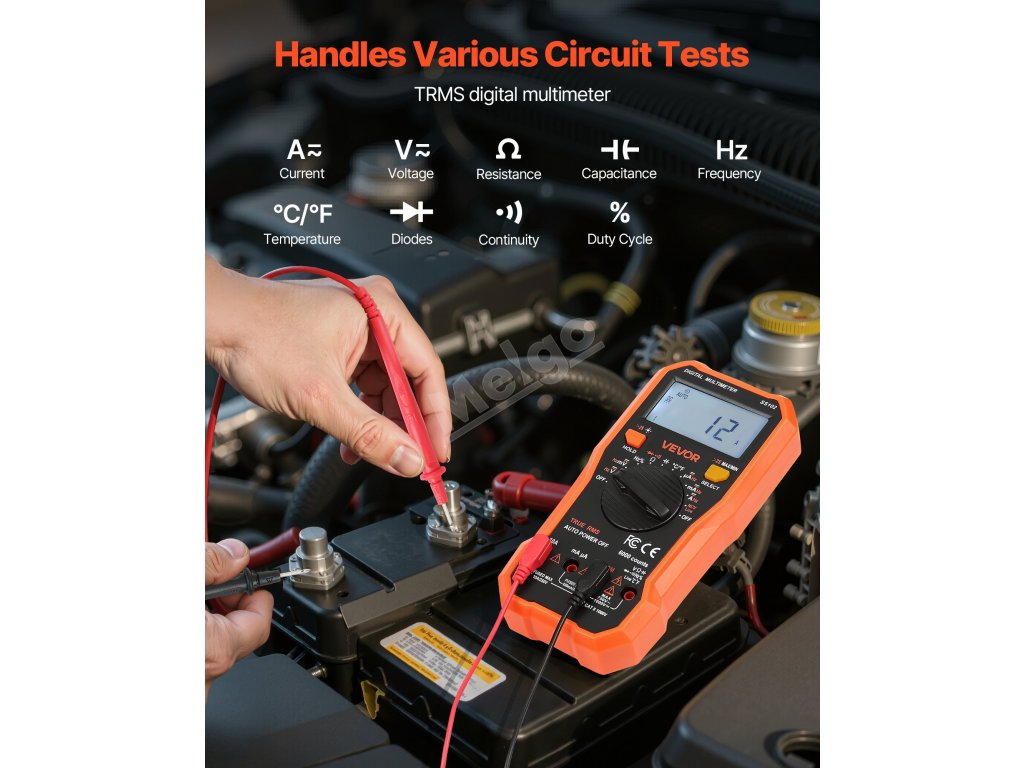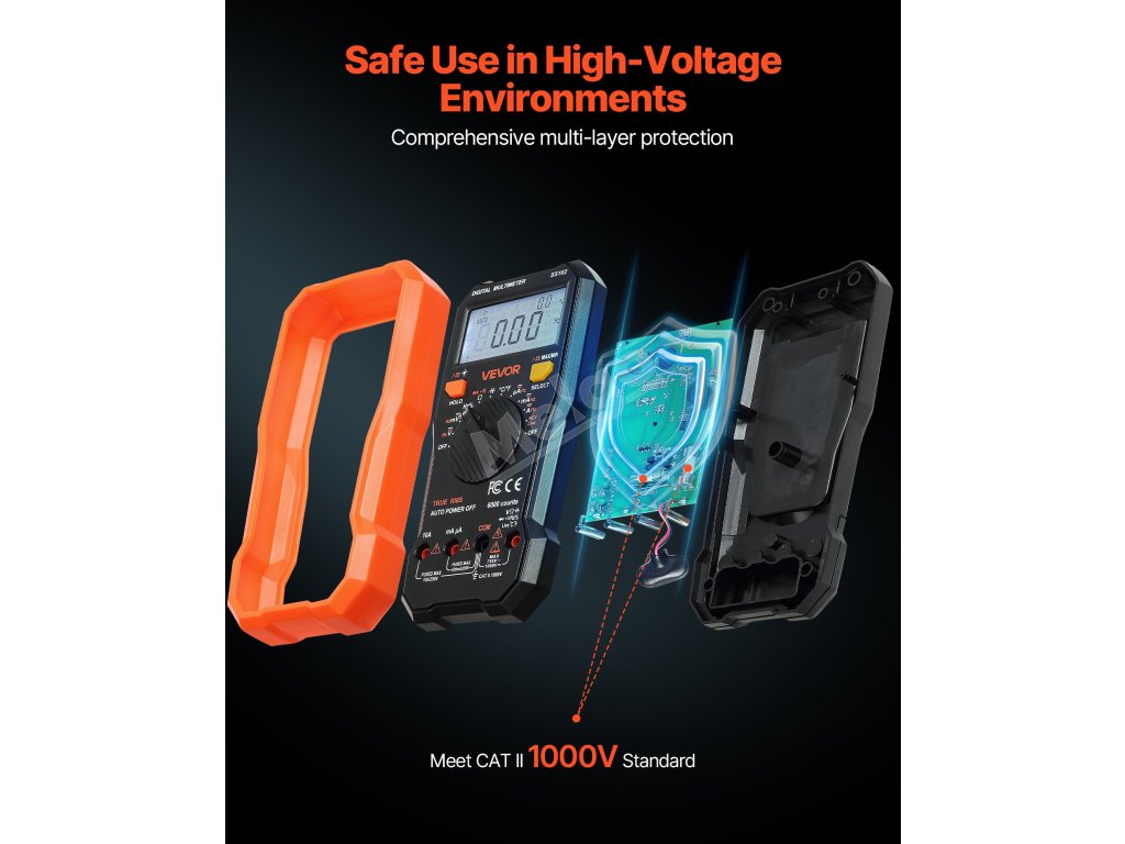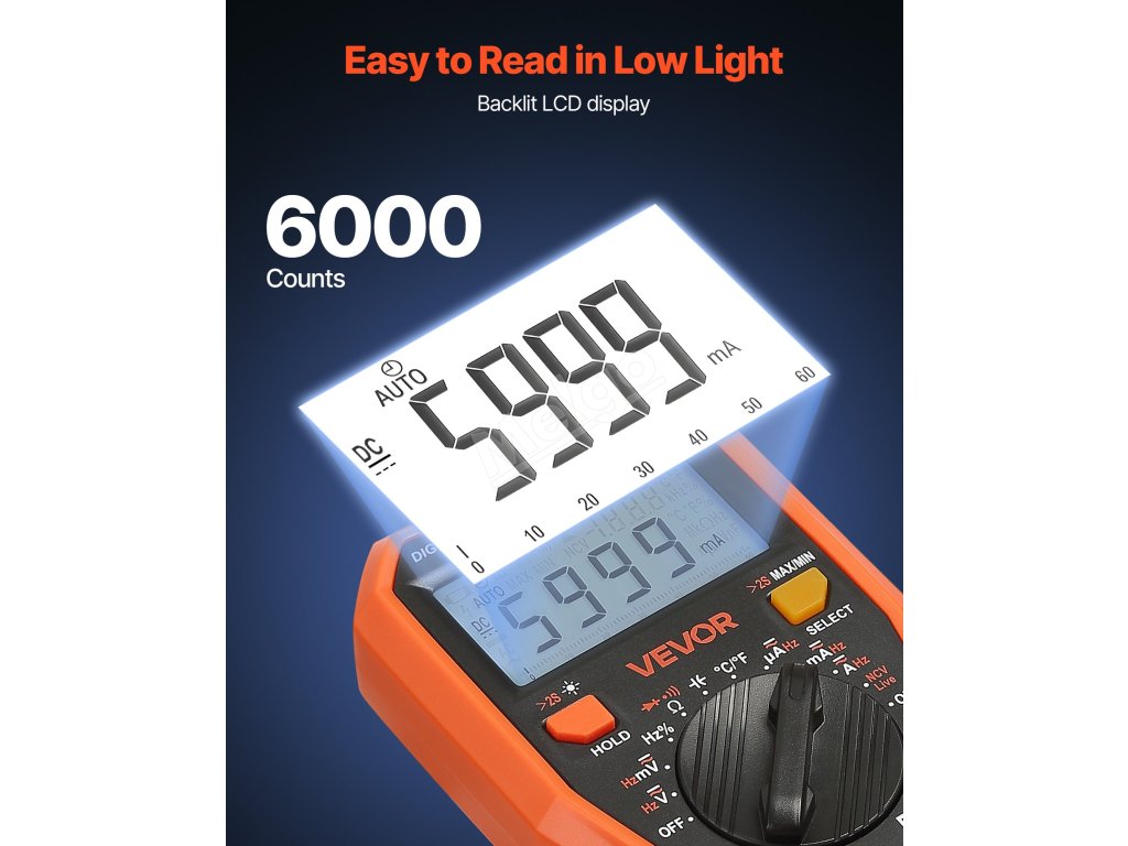 Digitální multimetr VEVOR 6000 s TRMS podporuje testování proudu, napětí, odporu, kapacity, frekvence, teploty, diod, spojitosti a pracovního cyklu. Díky technologii bezkontaktní detekce napětí (NCV) True RMS poskytuje přesnější, profesionálnější a bezpečnější elektrická měření.
