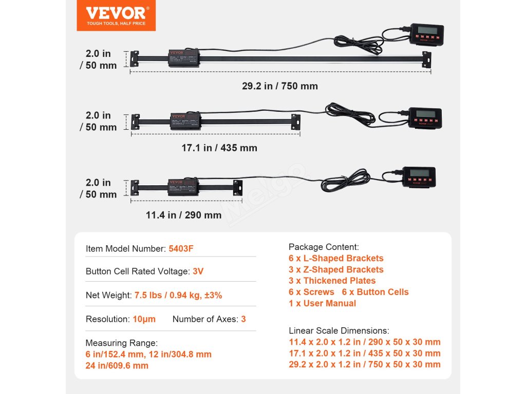 | Rozměry lineární stupnice | 11.4 x 2,0 x 1,2 in / 290 x 50 x 30 mm; 17,1 x 2,0 x 1,2 in / 435 x 50 x 30 mm; 29,2 x 2,0 x 1,2 in / 750 x 50 x 30 mm |