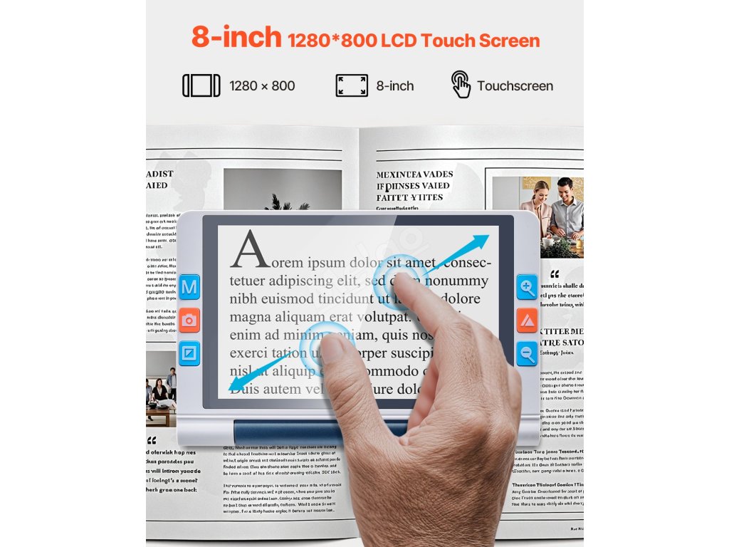 Tato digitální lupa pro zrakově postižené je vybavena 8palcovým velkým dotykovým displejem s vysokým rozlišením 1280 x 800. Poskytuje jasný obraz, antireflexní displej a pohodlné sledování, takže je ideální pro osoby se slabým zrakem pro každodenní čtení nebo prohlížení obrázků.