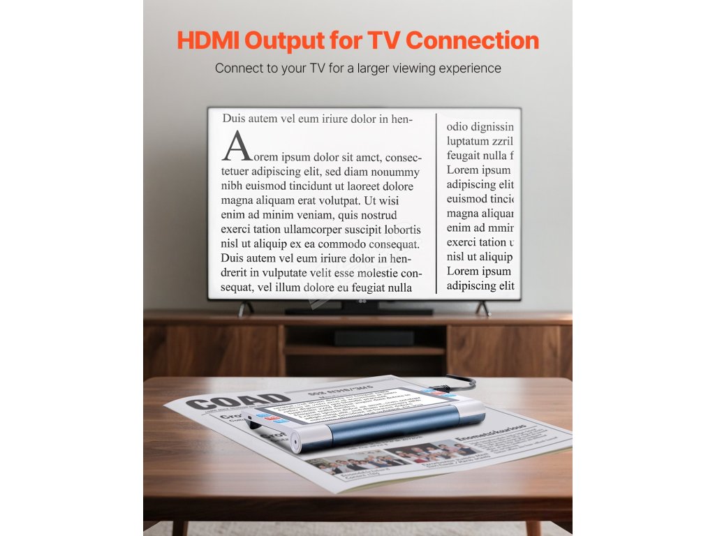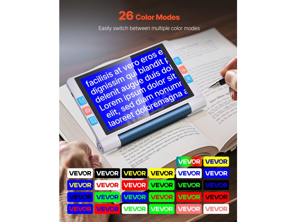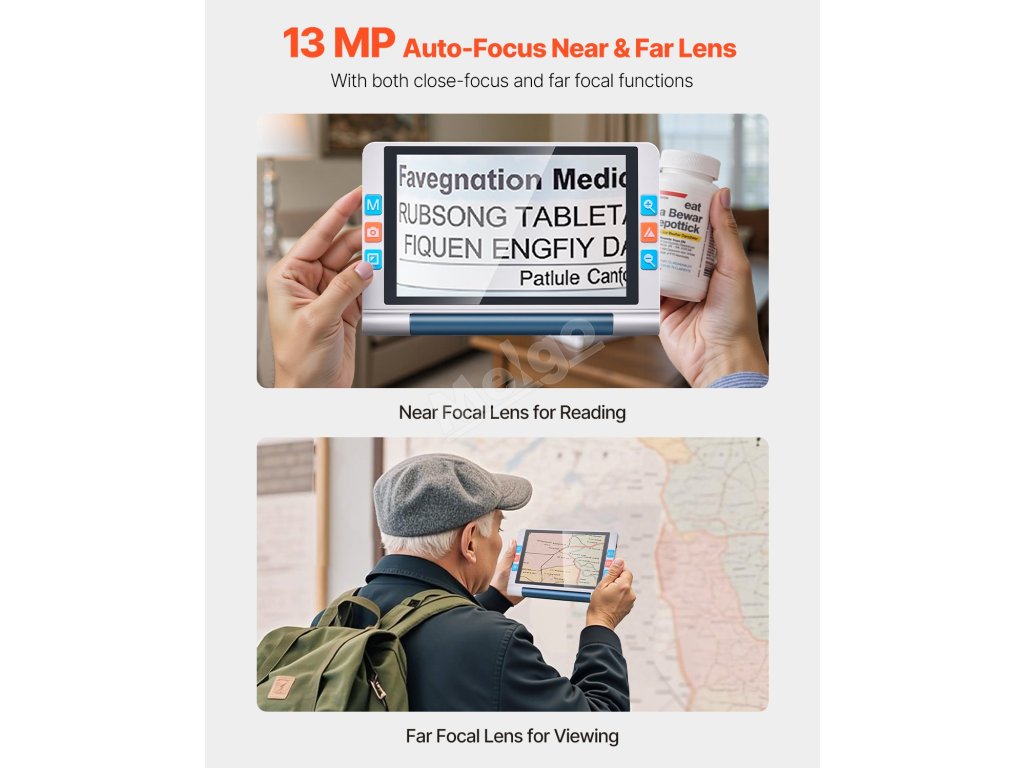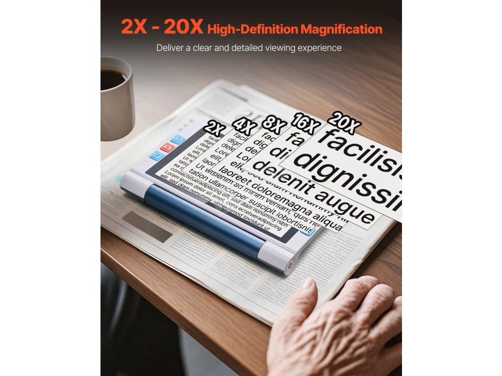 Tato přenosná digitální lupa s 8,0palcovým dotykovým HD displejem, 13MP objektivem s automatickým zaostřováním, 2 až 20násobným zvětšením, 26 barevnými režimy, 6stupňovým jasem LCD, výstupem HDMI a dobíjecí baterií 5200 mAh nabízí komplexní vizuální pomoc osobám se slabým zrakem při čtení a prohlížení obrázků.