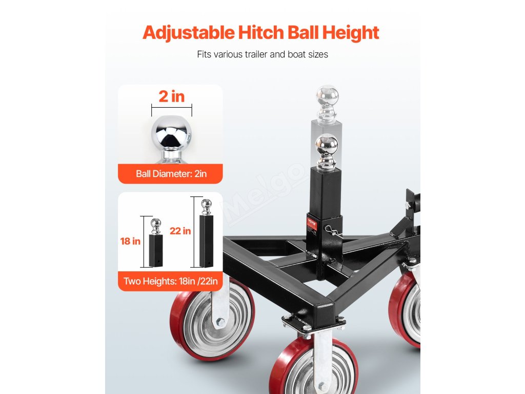 Tento vozík je vybaven 2palcovou koulí na závěs a je kompatibilní s většinou závěsů přívěsů. Můžete si vybrat ze dvou nastavitelných výšek 18 nebo 22 palců, aby se přizpůsobil přívěsům různých velikostí.