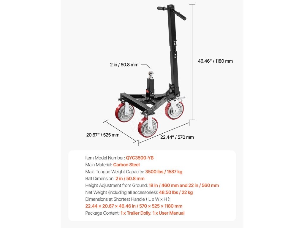 Dolly na přívěs, nosnost 3500 lbs, výška 18-22 inch, 8-inch kola