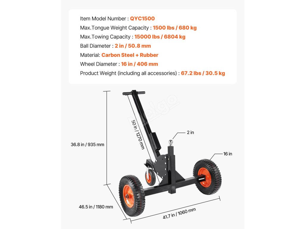 Dolly na přívěsy nosnost 1500lbs, 2 in tažný čep, 16 in pneumatiky