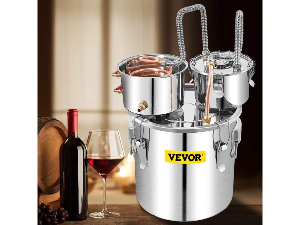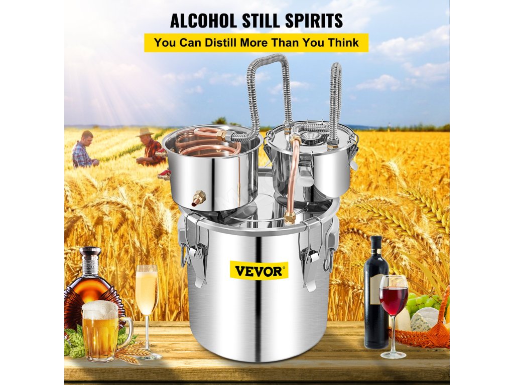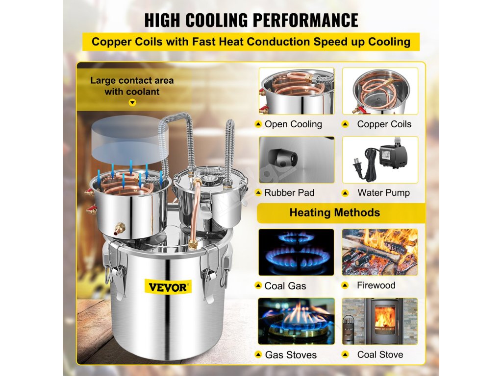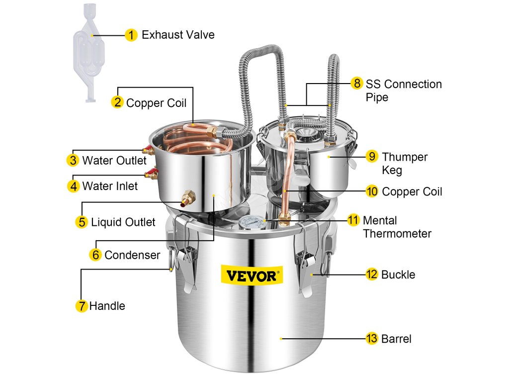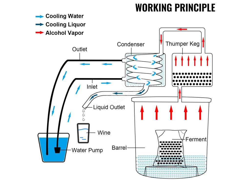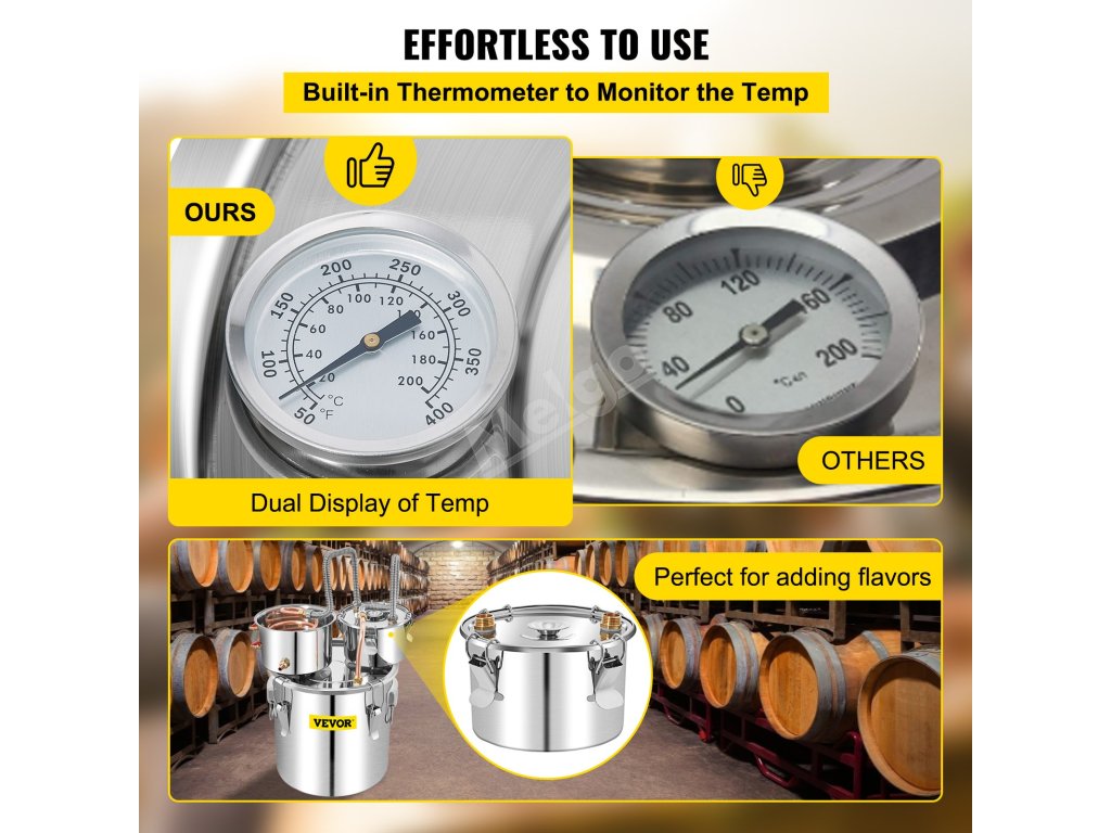 Díky vestavěným teploměrům podle stupňů Celsia a Fahrenheita lze destilaci lépe kontrolovat a zpřesnit. Obsluha může rychle zkontrolovat teplotu za chodu destilačního zařízení, čímž je zajištěn lepší destilační výkon. Cirkulace chladicí vody je nutná, když teplota dosáhne přibližně 80 stupňů. Tento destilační přístroj je dodáván s tromlovaným sudem, do kterého můžete podle potřeby přidávat koření nebo bylinky a upravovat tak požadovanou chuť.