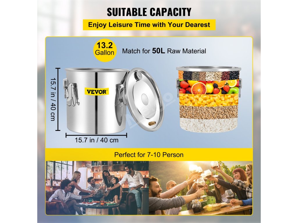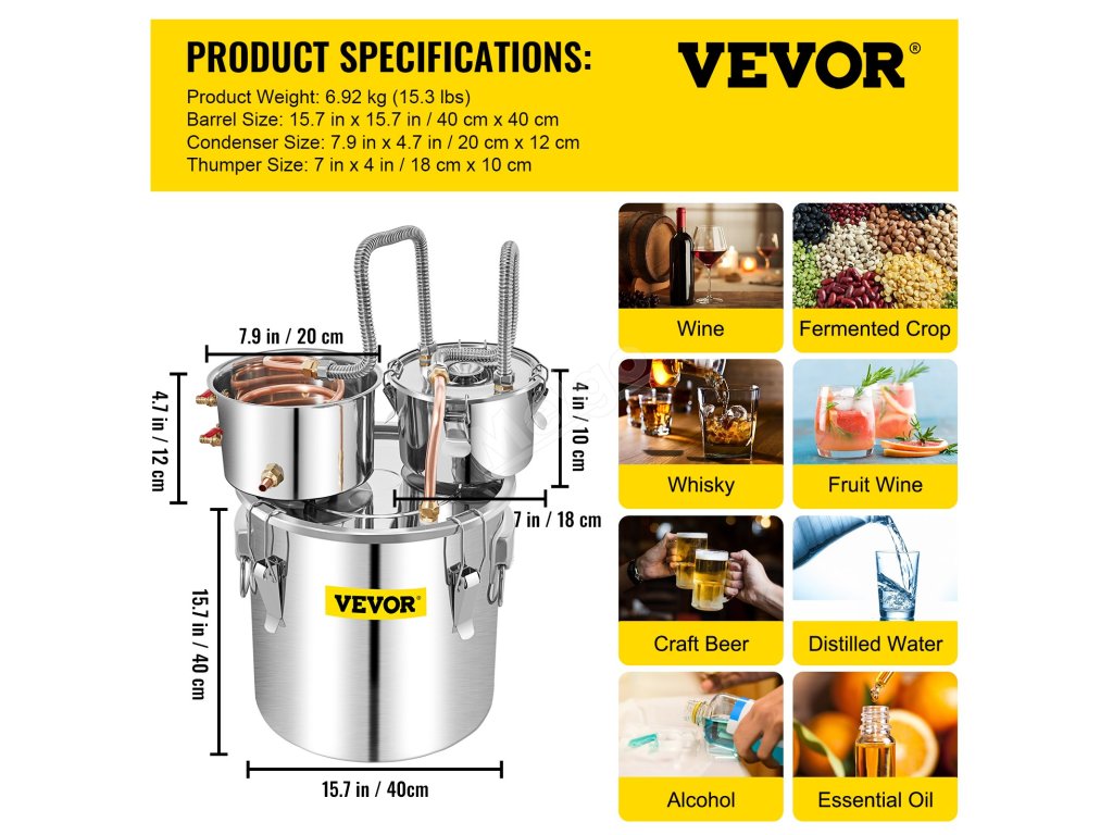 Kapacita palírny je 13,2 galonu, což odpovídá 50 litrům surovin. Velikost sudu: 15,7 x 15,7 cm (40 x 40 palců). Kondenzátor: 7,9 x 4,3" (20 x 12 cm). Hrnec: 7 "x4" (18x10 cm). Vhodné pro trávení volného času s rodinou nebo přáteli.