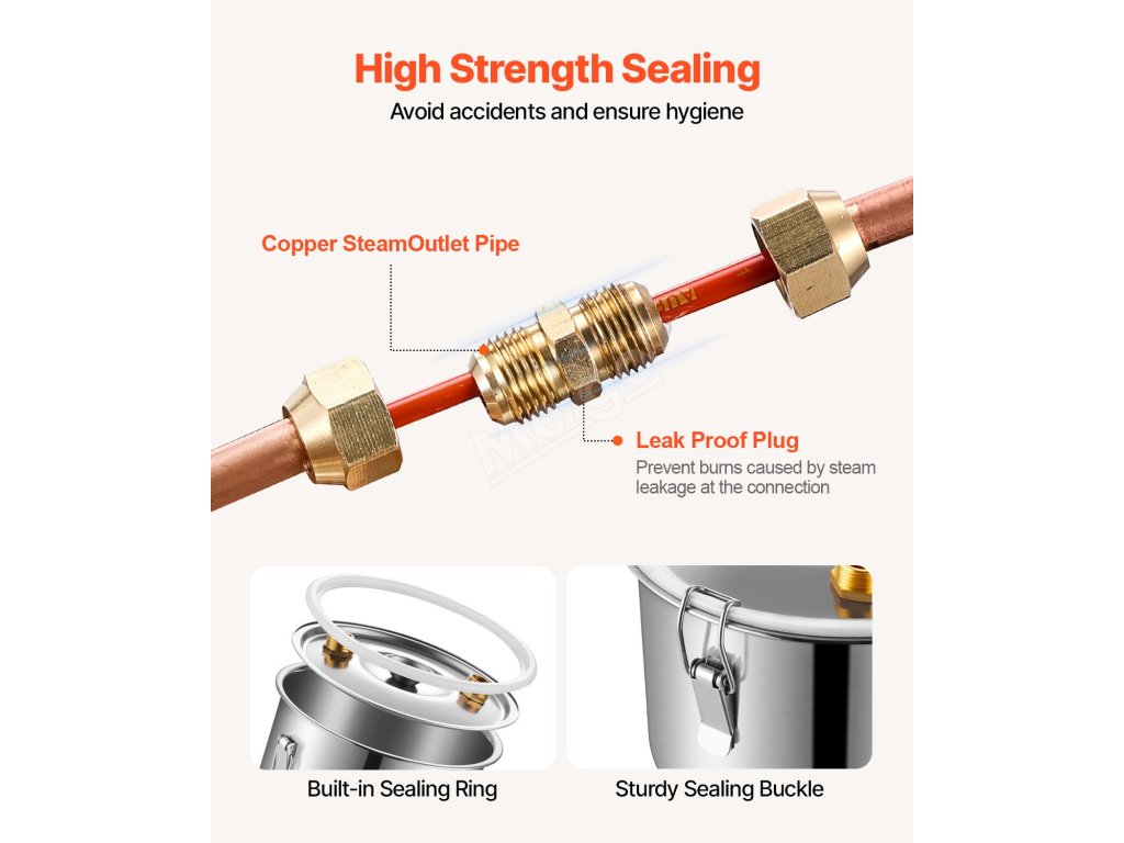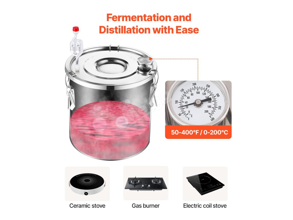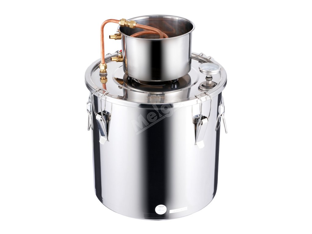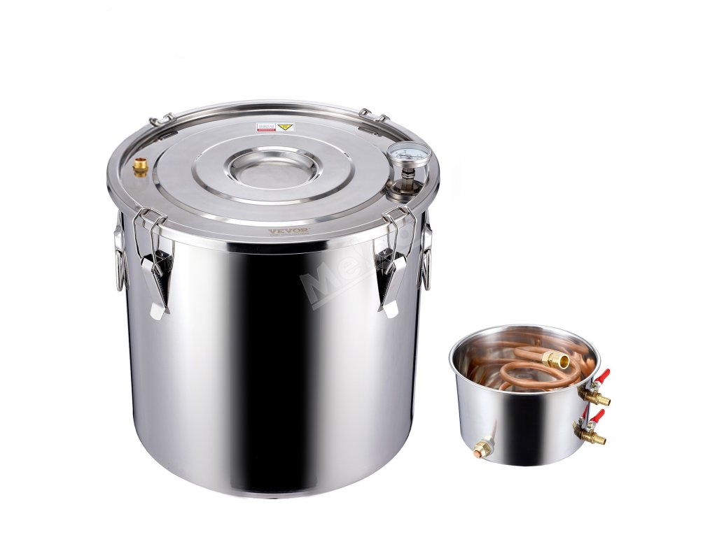 Tato destilační sada obsahuje kvasný sud a chladicí nádobu, obě vyrobené z potravinářské nerezové oceli, které zajišťují bezpečný kontakt během celého procesu vaření a destilace, takže výsledný produkt je vhodný k pití s klidným svědomím.