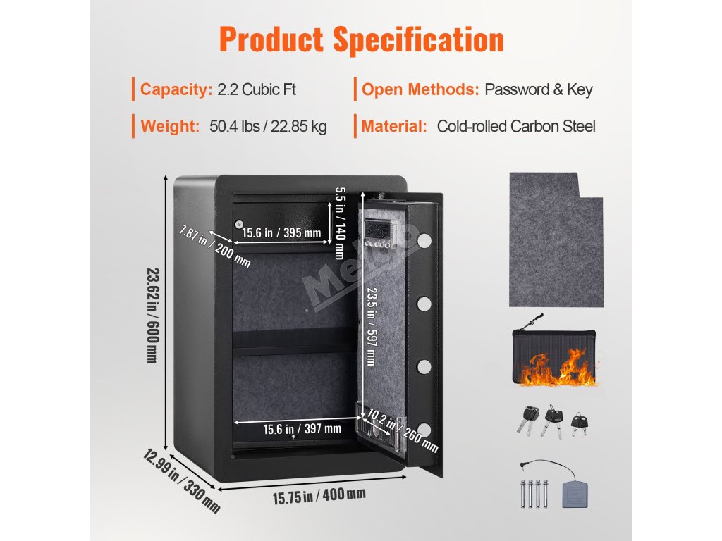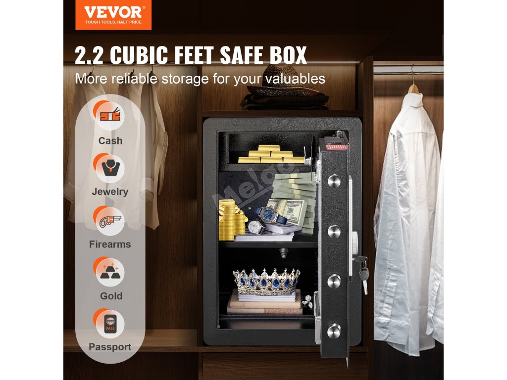 S kapacitou 2,2 kubických stôp poskytuje trezor VEVOR dostatok priestoru na uloženie. Môžete doň uložiť všetko od hotovosti a zlata až po dôležité dokumenty. Priestranný interiér umožňuje jednoduchú organizáciu. Vďaka tomu ľahko nájdete to, čo potrebujete, keď to potrebujete. Trezor je svojou veľkosťou ideálny na domáce použitie, pohodlne sa zmestí do každej miestnosti. Jeho priestrannosť zaručuje dostatok miesta pre všetky vaše najdôležitejšie predmety. Preto je ideálnou voľbou pre tých, ktorí chcú zabezpečiť svoje cennosti.