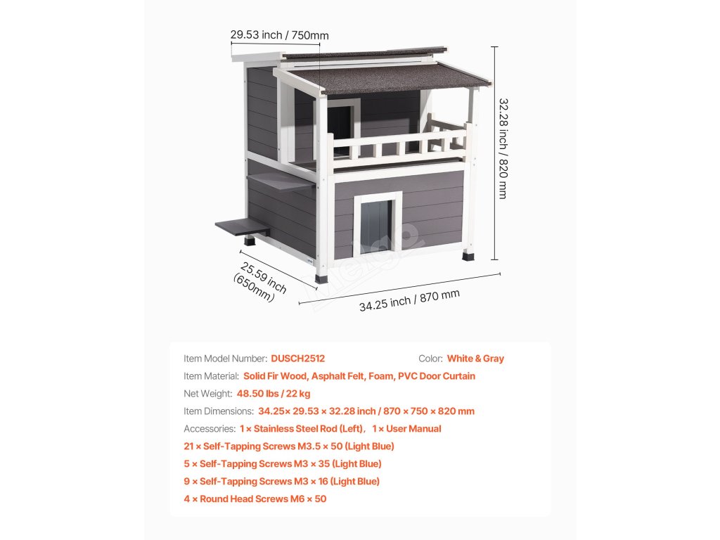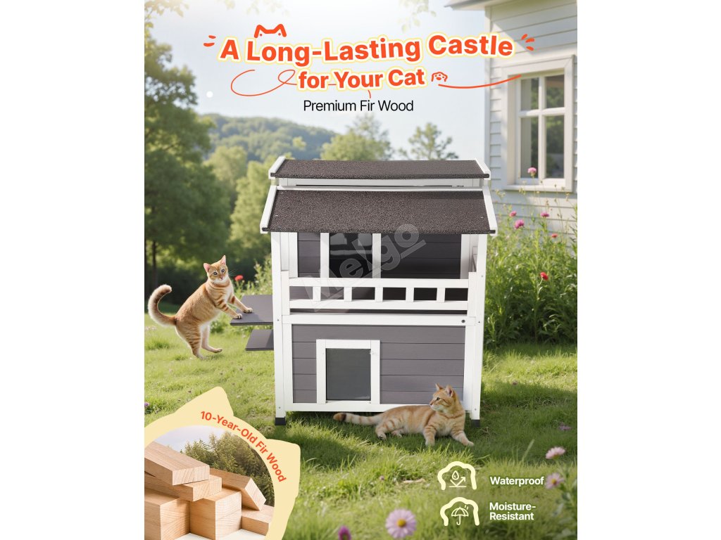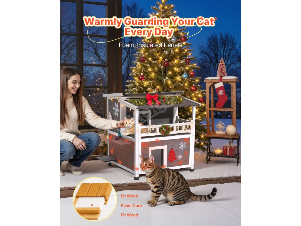 Dřevěný přístřešek pro kočky 33" je vyroben z kvalitního jedlového dřeva, je udržitelný a má dlouhou životnost. Čtyřstranná pěnová izolace udržuje kočky v teple v chladném počasí, zatímco prostorný interiér umožňuje šplhání a hru.