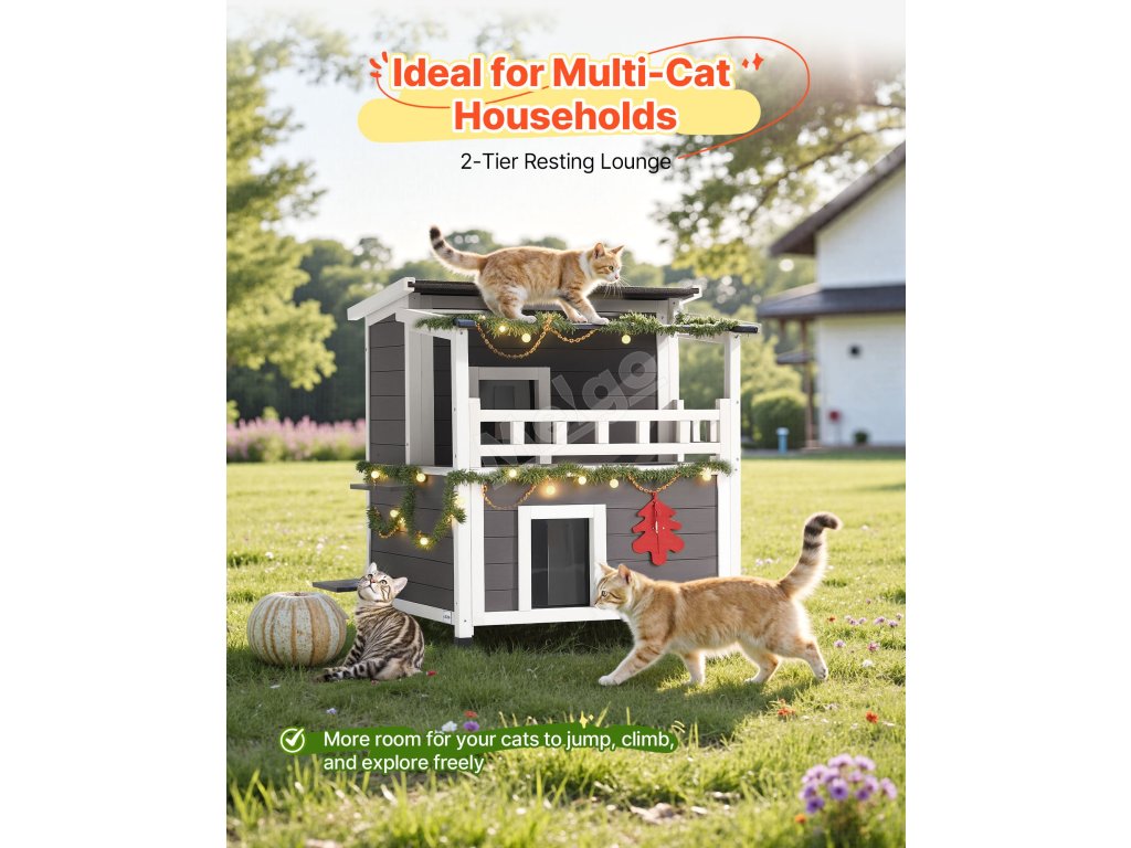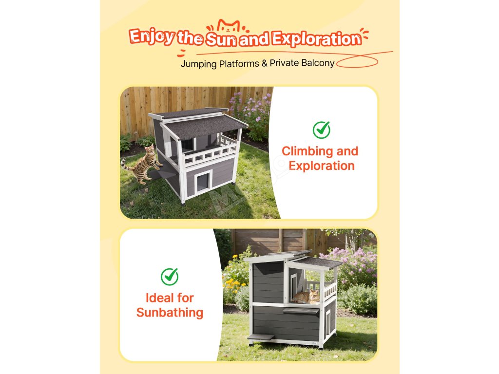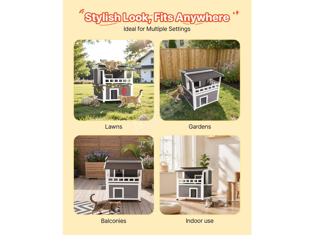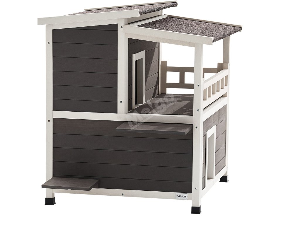 Tento zvýšený útulek pro kočky má velké boční dveře, které jsou ideální pro větší kočky nebo rodiny s více kočkami. Vyvýšená plošina pro skákání poskytuje kočkám další prostor pro šplhání, zkoumání a vyhřívání na slunci.