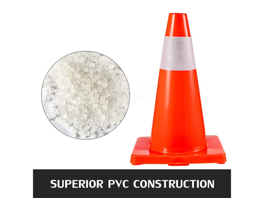 Díky vysoce kvalitnímu materiálu PVC jsou tyto dopravní kužely lehké, ale odolné vůči ultrafialovému záření, vlhkosti, olejům a extrémním teplotám a povětrnostním podmínkám.