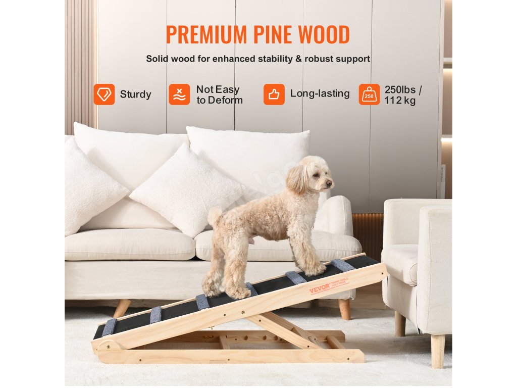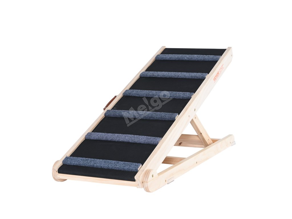 Tato nastavitelná rampa pro psy vyrobená z prvotřídního borovicového dřeva je mimořádně stabilní a odolná. Její trojúhelníková konstrukce dodává dodatečnou pevnost a protiskluzové spodní podložky zvyšují stabilitu. Díky svým výjimečným vlastnostem zůstává stabilní i při přenášení osob.