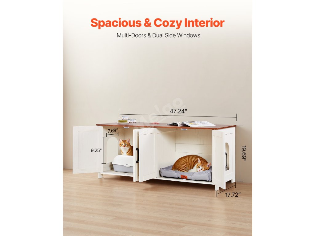 Velký prostor se dvěma okny umožňuje kočce volný přístup a většina psů se do něj nedostane, takže vaše kočka bude v bezpečí a v soukromí. Nezáleží na tom, jakou velikost steliva používáte, tento nábytek pro kočky se do něj dokonale vejde a poskytne dostatek prostoru pro pohyb.