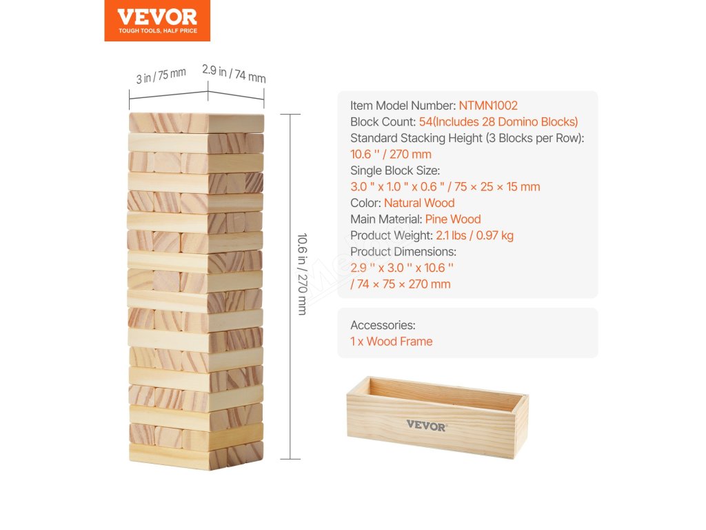 Sada na bubnování obsahuje 54 kostek o rozměrech 3,0" x 1,0" x 0,6". Z toho 28 bloků obsahuje domino tečky, což vám umožní užívat si nejen dřevěné věže, ale také domino a hry na míru. Věž může dosáhnout výšky až 2 stopy, což představuje vzrušující výzvu!