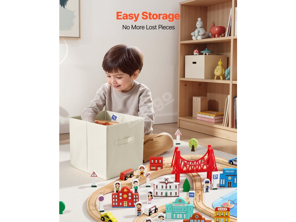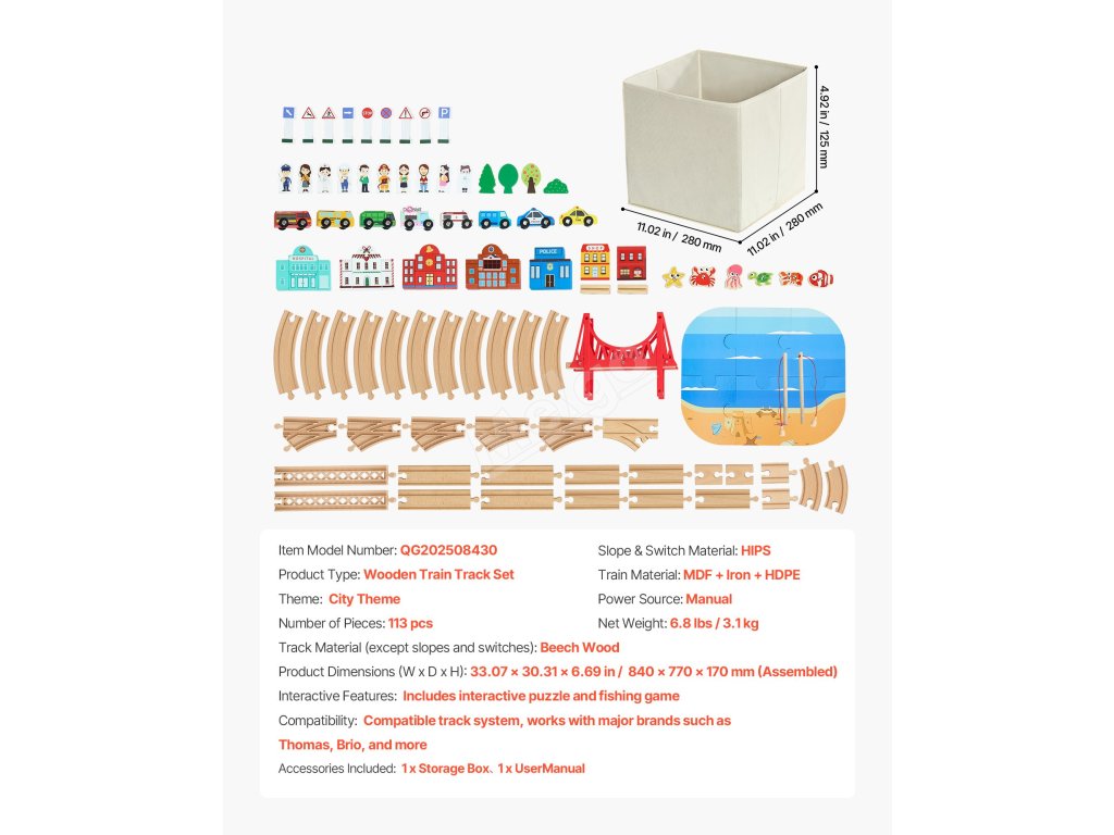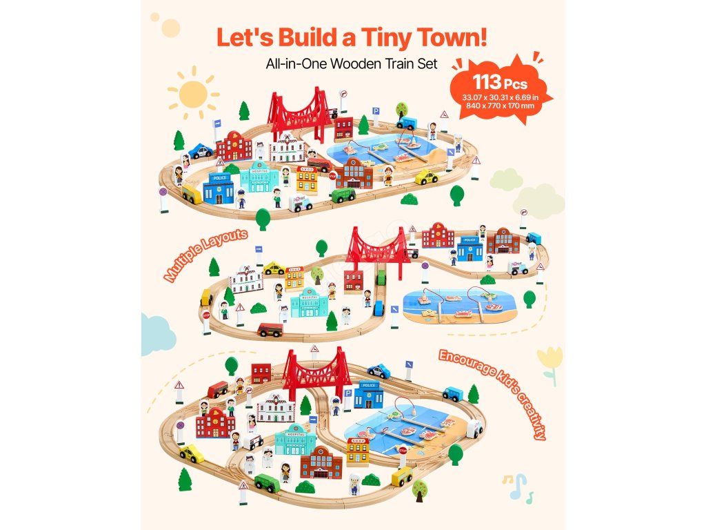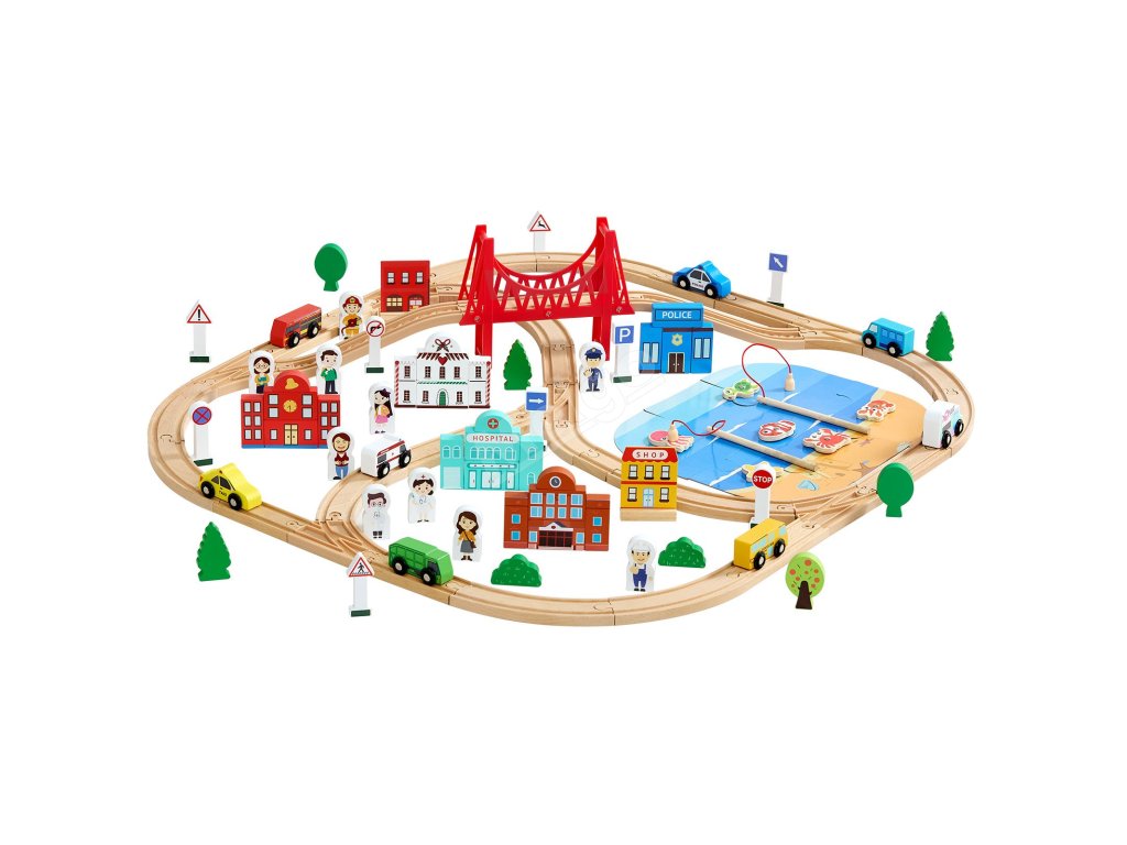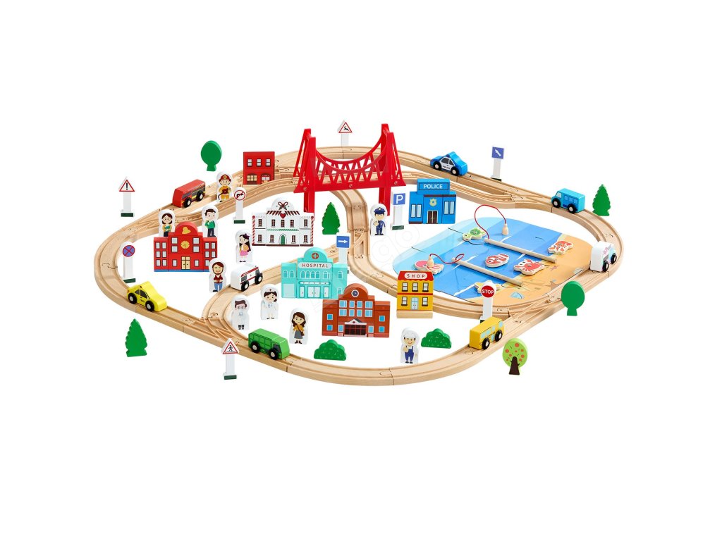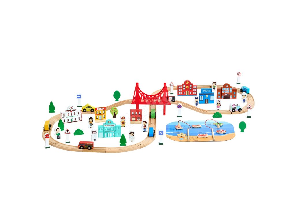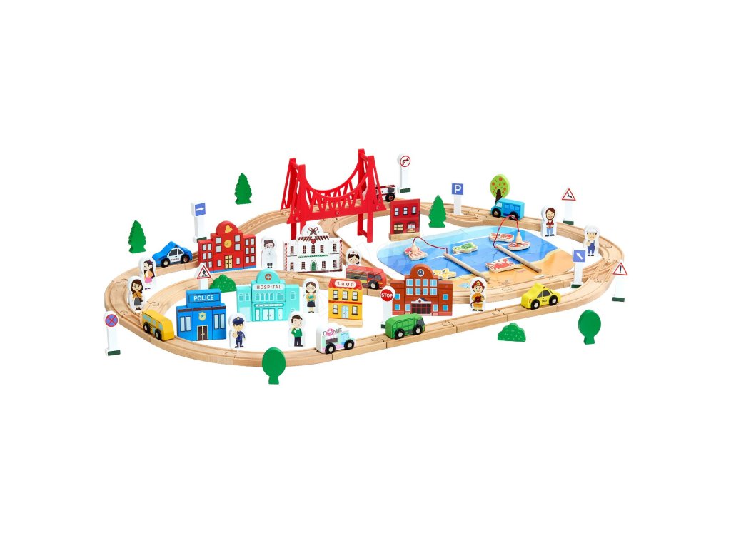 Dřevěná vlaková souprava 113 dílů, 3–8 let, se krabicí a městem