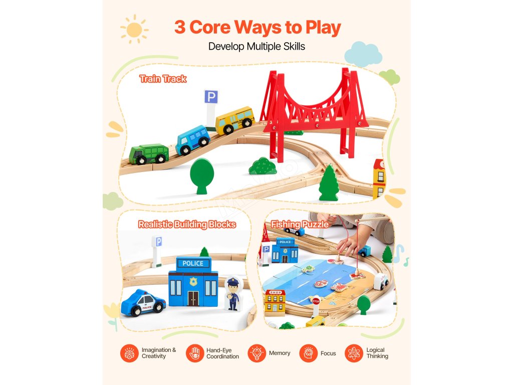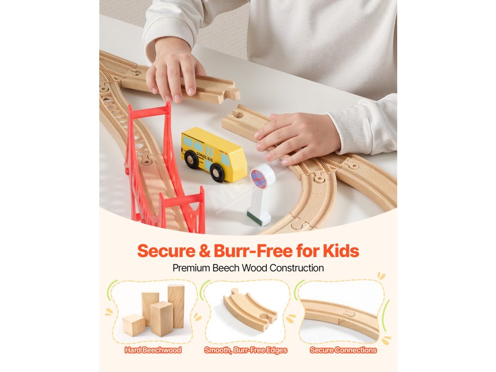 Tato dřevěná vláčkodráha je určena pro děti ve věku 3-8 let. Děti mohou vyzkoušet více možností sestavení, odemknout různé herní scénáře a dokonce si hrát společně s kamarády nebo sourozenci, což podporuje týmovou spolupráci. Je to také ideální volba pro zábavné chvíle s rodinou.