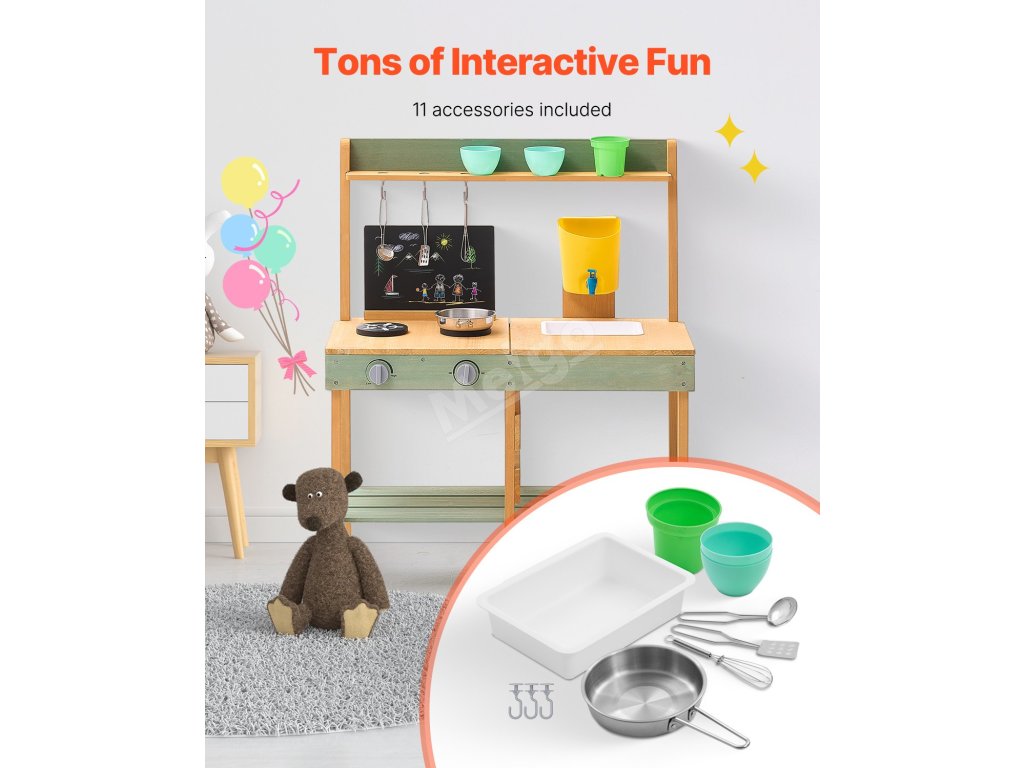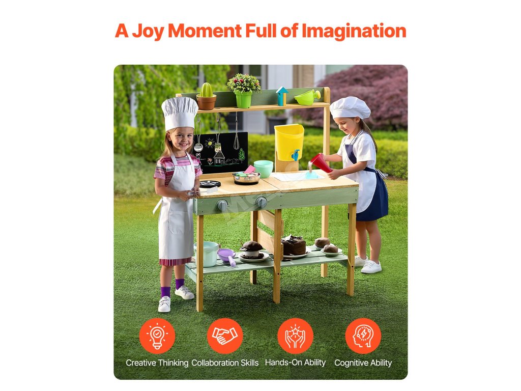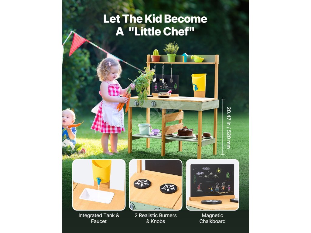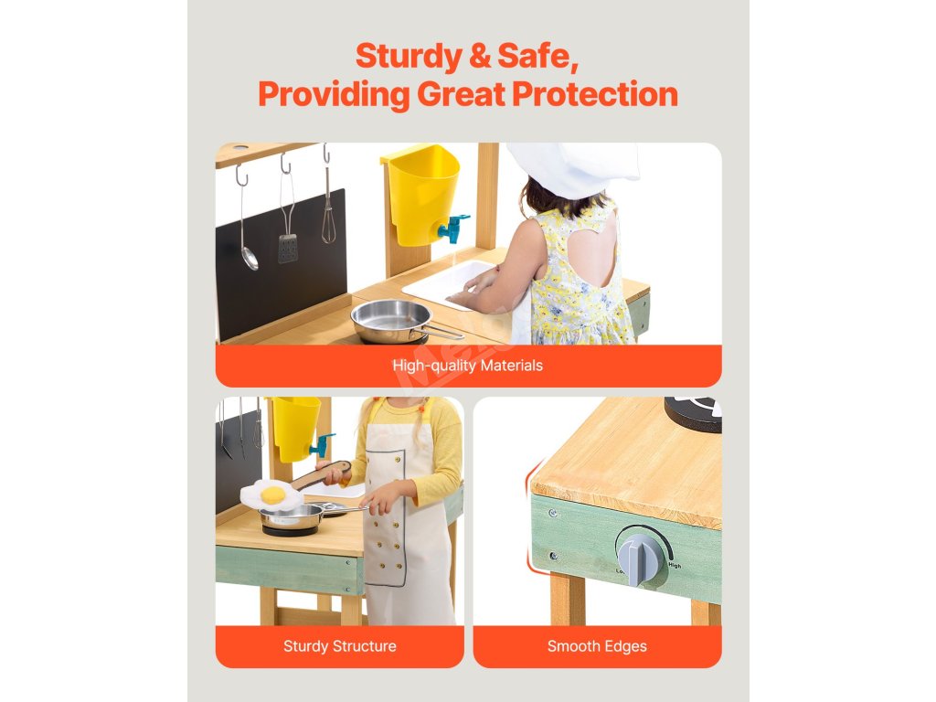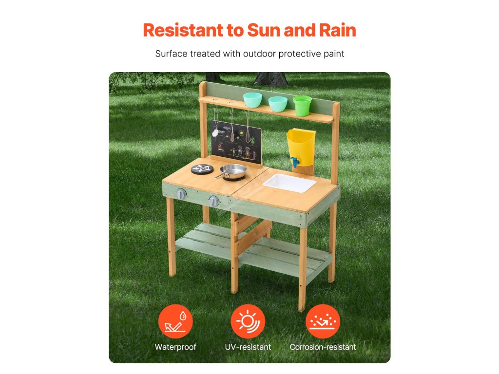 Tato nápaditá hrací kuchyňka pro batolata je opatřena venkovní barvou, která je odolná proti vodě a korozi, takže je ideální pro venkovní prostředí, jako jsou zahrady, dvory a trávníky.