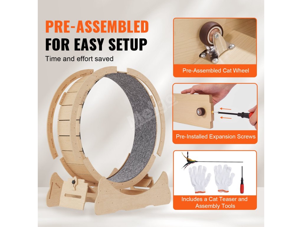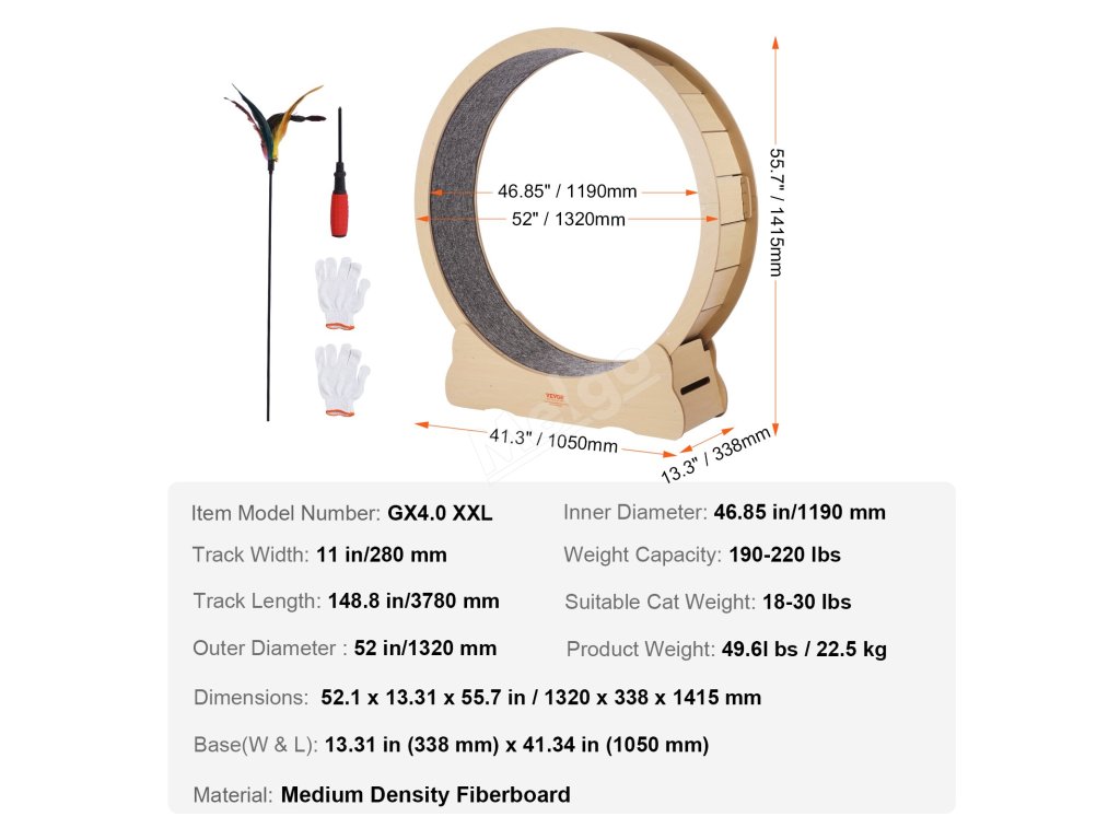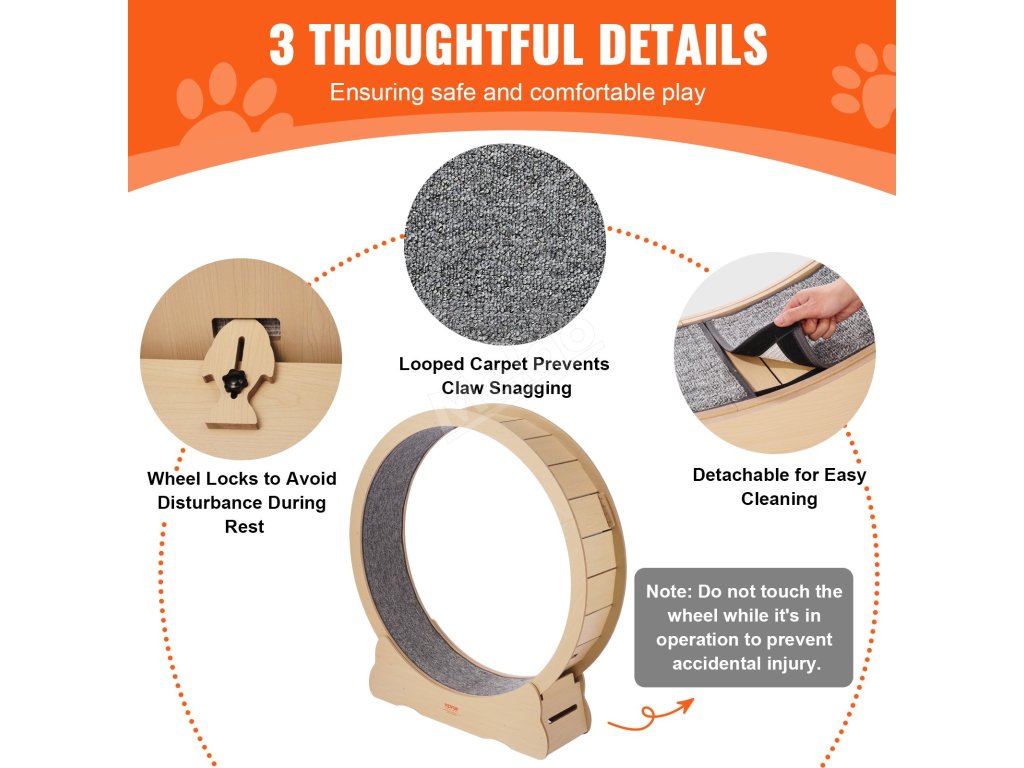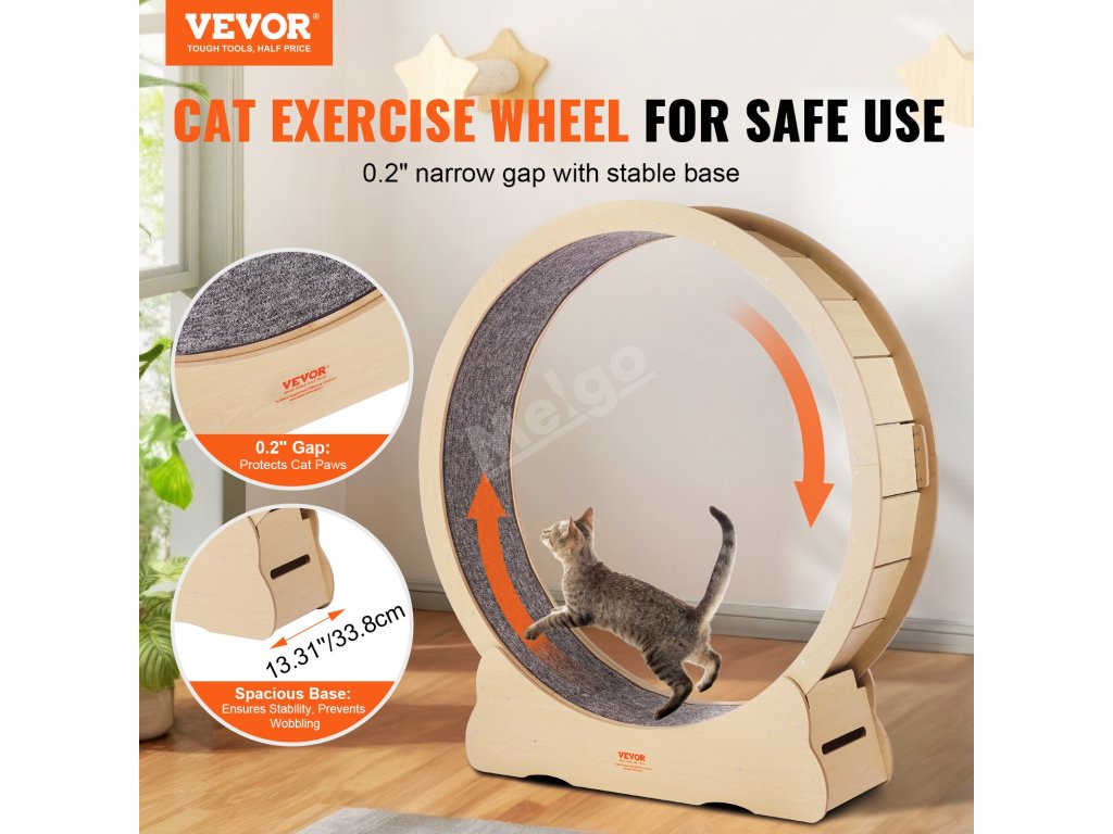 Toto kolečko na cvičení koček je vyrobeno z dřevovláknité desky střední hustoty, která zaručuje jeho trvanlivost. Díky prostorné základně o šířce 13,31 palce poskytuje vaší kočce stabilní povrch pro cvičení. Jedinečná konstrukce s mezerou 0,2"/6 mm zajišťuje bezpečnost a umožňuje vašemu kočičímu společníkovi volný běh po kolečku.