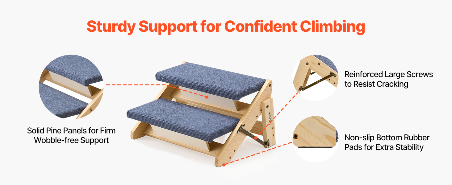 Desky z borovicového dřeva s velkými šrouby poskytují pevnou oporu a omezují kývání, takže domácí zvířata mohou bez obav šplhat.