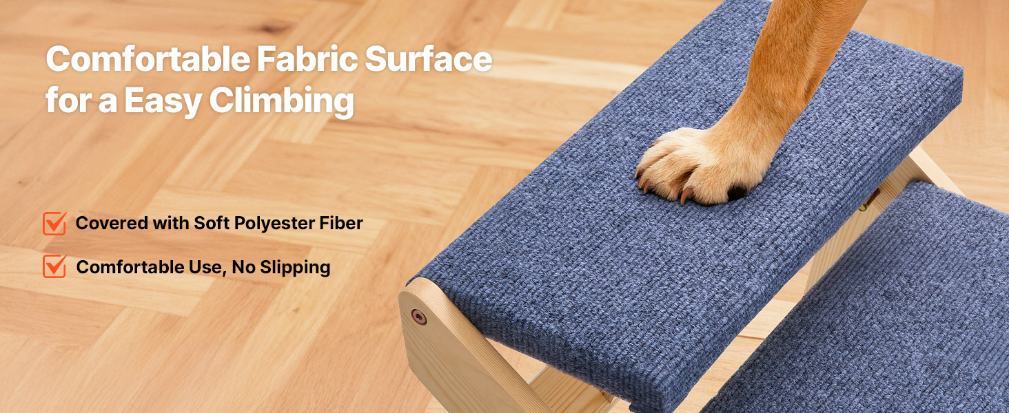 Tyto schůdky do pelíšku pro psy mají schůdky potažené látkou, které zajišťují lepší přilnavost tlapek a měkčí povrch, který pomáhá předcházet uklouznutí a zranění domácích mazlíčků.