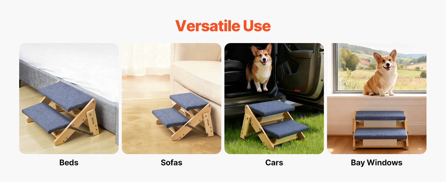 Naše skládací schody pro psy jsou ideální pro malé až středně velké psy, starší domácí mazlíčky nebo zraněné mazlíčky, kteří potřebují pomoc při lezení na vyšší nábytek.