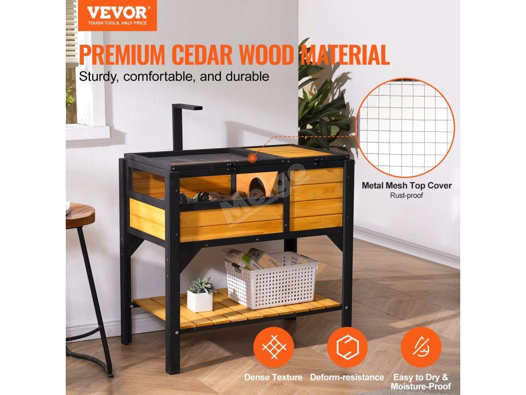 Náš domek pro želvy je vyroben z prvotřídního cedrového dřeva, které je známé svou hustou strukturou, trvanlivostí a odolností proti deformacím. Zvenku je natřen voděodolnou barvou. Vysoce kvalitní horní část z kovového pletiva je pevně tkaná a poskytuje vašemu zvířeti bezpečný a pohodlný prostor pro život a hraní.