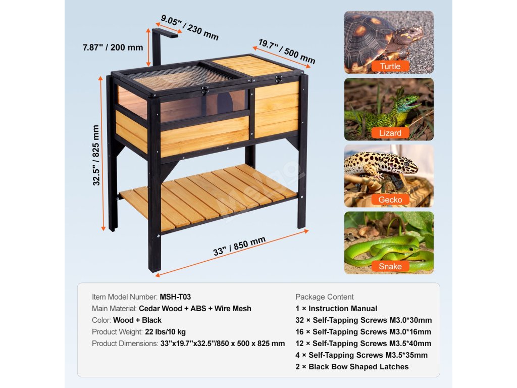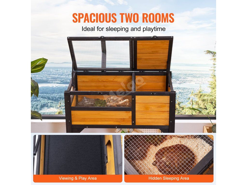 Želví výběh o rozměrech 33 "x19,7 "x32,5" zahrnuje soukromý prostor pro spaní s horní částí a veřejný prostor pro pozorování s vysoce průhledným bočním panelem z ABS. Uzamykatelný horní kryt s vysoce hustou síťovinou účinně brání úniku zvířete. Vhodný pro celou řadu malých zvířat.