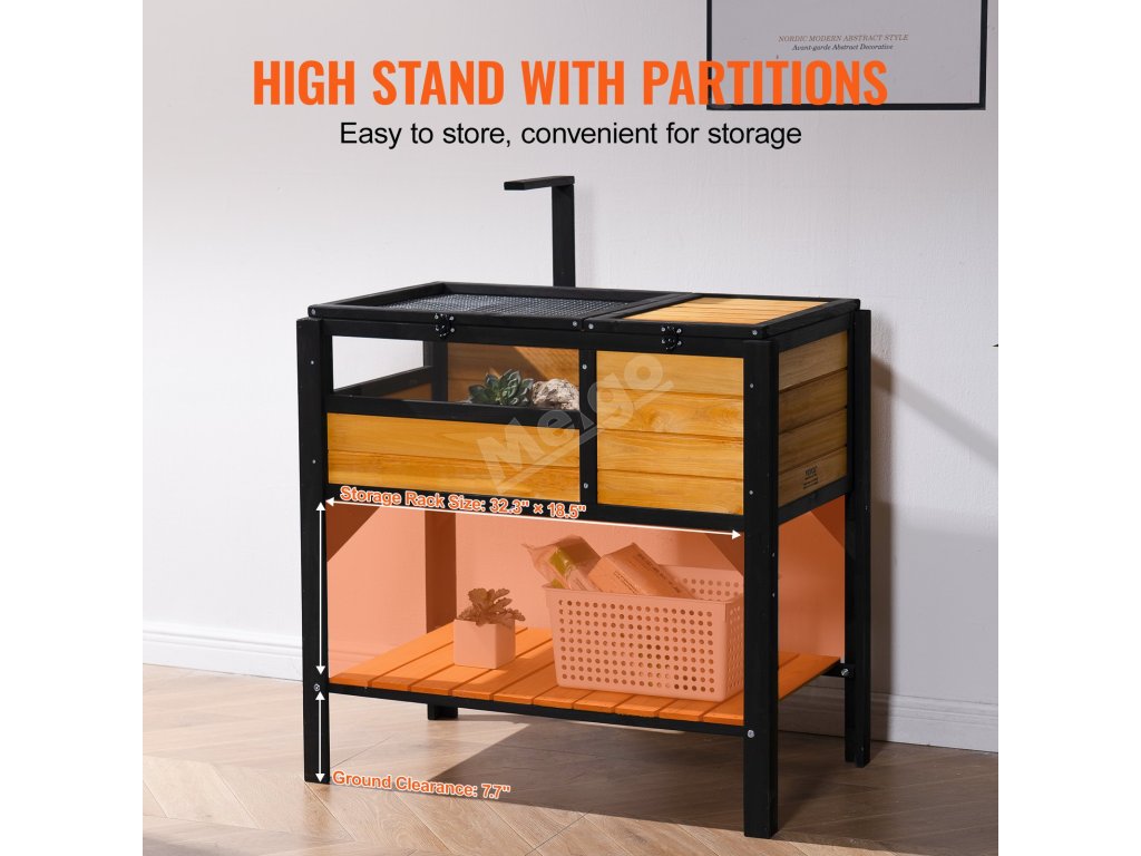 Konstrukce s vysokými nohami je vybavena policí pro pohodlný přístup k potřebám pro domácí zvířata, která pojme až 44 kg, což usnadňuje krmení, aniž by zabírala další místo.