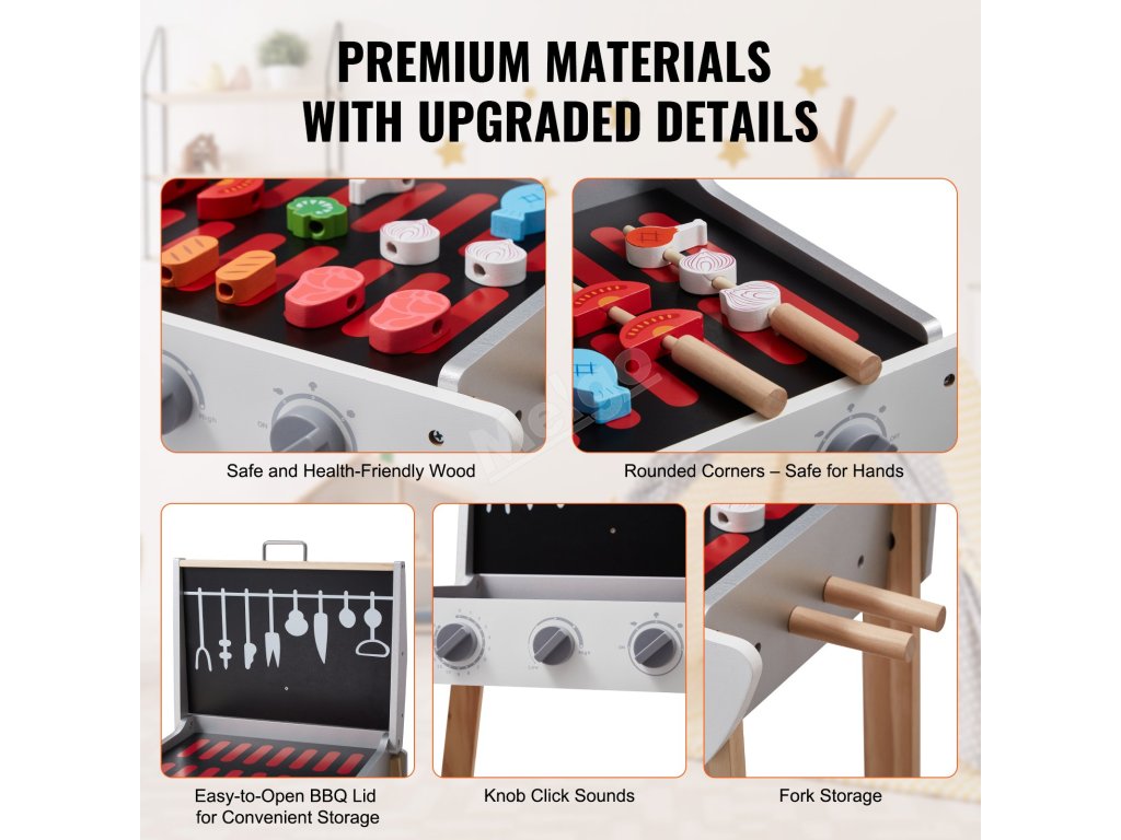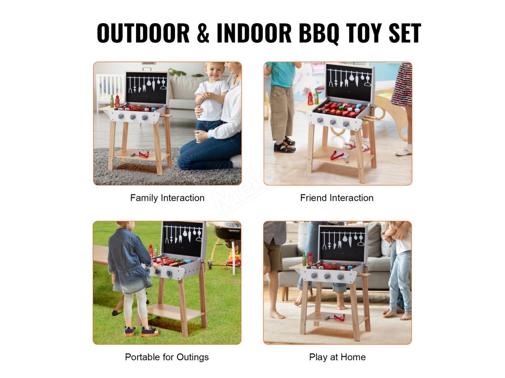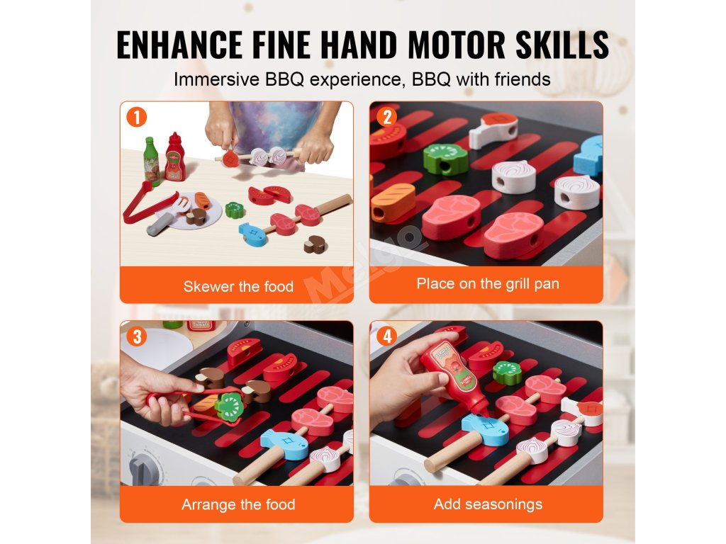 Tato dětská hrací sada na grilování pomáhá dětem rozvíjet koordinaci rukou a očí a učit se o grilování a různých potravinách. Je ideální pro hraní o samotě nebo s kamarády a podporuje rozvoj dovedností a hravé učení.