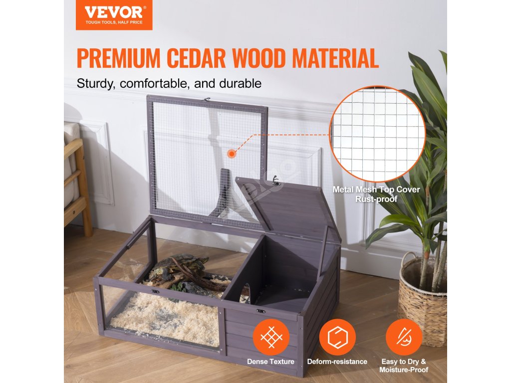 Náš domek pro želvy je vyroben z prvotřídního cedrového dřeva, které je známé svou hustou strukturou, trvanlivostí a odolností proti deformacím. Zvenku je natřen voděodolnou barvou. Vysoce kvalitní horní část z kovového pletiva je pevně tkaná a poskytuje vašemu zvířeti bezpečný a pohodlný prostor pro život a hraní.