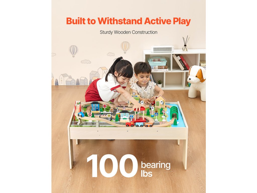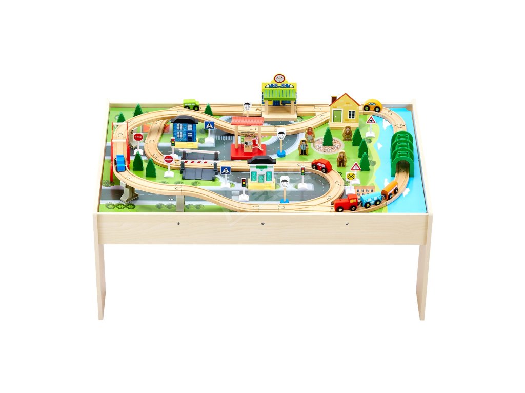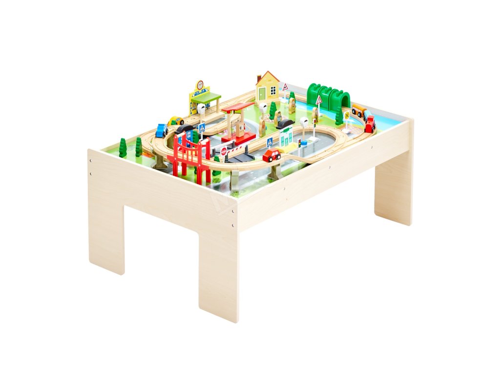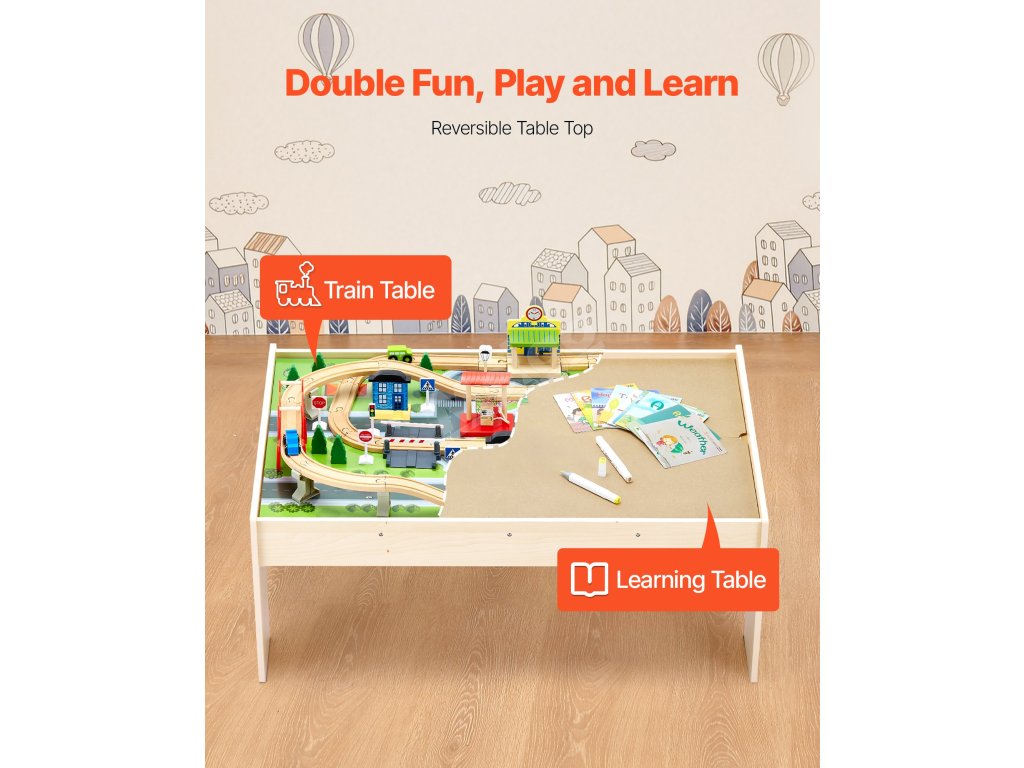 Tento 84dílný vláčkodráhový stůl má oboustranný design: barevnou mapu na hraní a hladký povrch na učení. Má robustní dřevěnou konstrukci, unese až 100 kg a obsahuje skládací úložný koš pro snadné uspořádání.