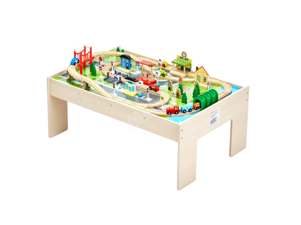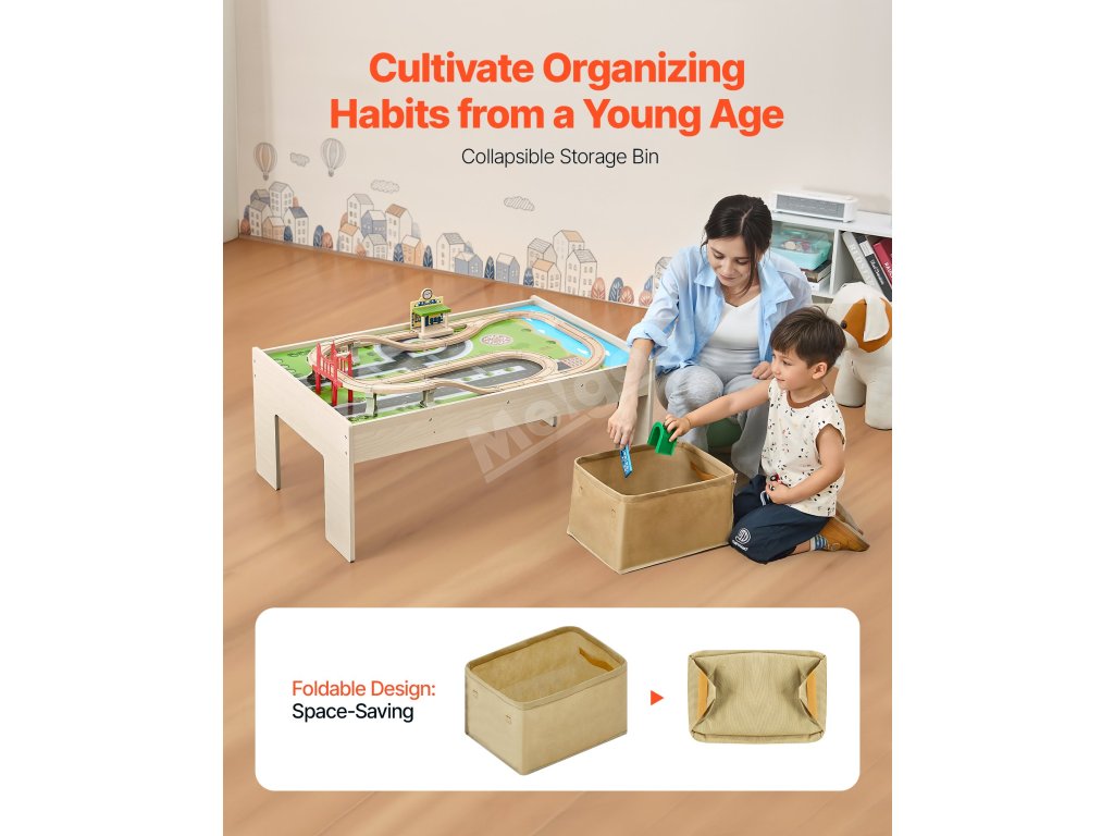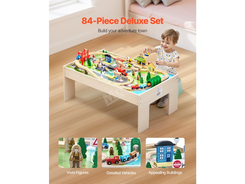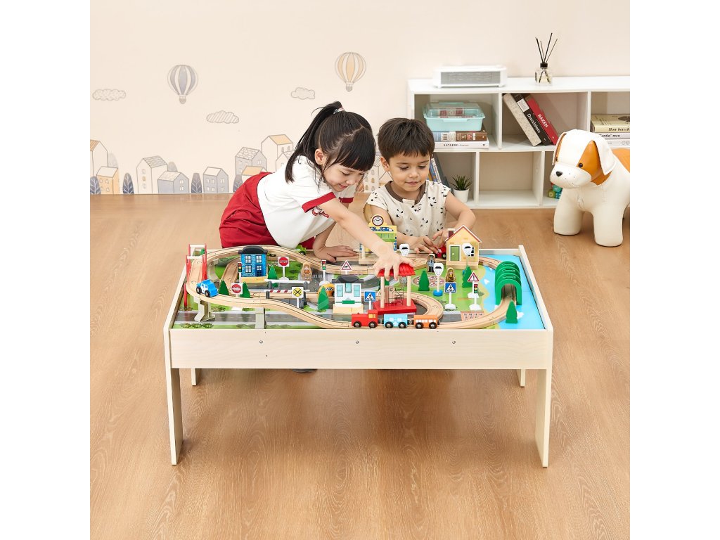 Tento 84dílný vláčkodráhový stůl má oboustranný design: barevnou mapu na hraní a hladký povrch na učení. Má robustní dřevěnou konstrukci, unese až 100 kg a obsahuje skládací úložný koš pro snadné uspořádání.