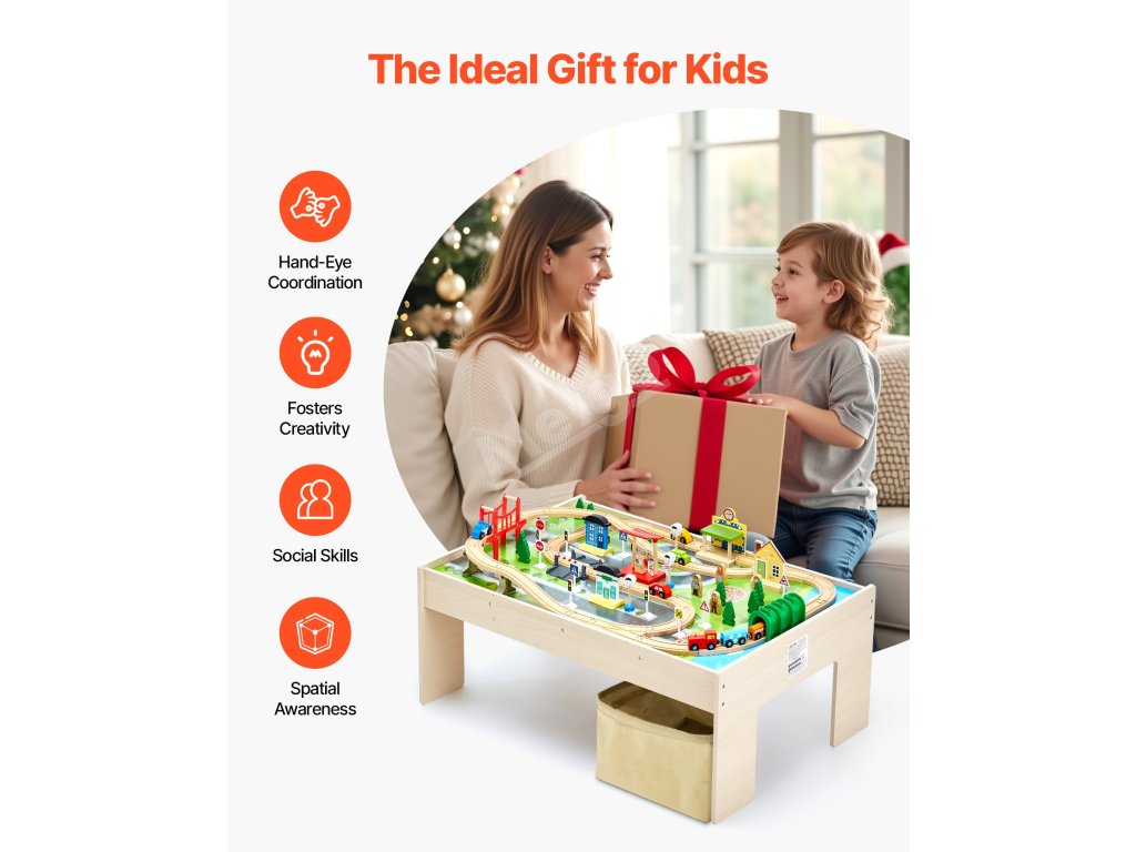 Tento dřevěný stůl pro děti je ideálním dárkem k Vánocům, narozeninám a dalším svátkům. Děti si při hře mohou rozvíjet dovednosti, jako je koordinace ruka-oko, prostorové plánování, sociální interakce, představivost a organizace.