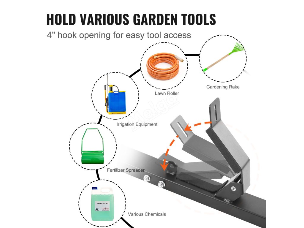 Háčky lze otevřít až na 4", což umožňuje zavěsit sekačky a umístit různé zahradní nářadí a vybavení. Víceúčelové stojany na strunové sekačky umožňují snadný přístup a umístění.