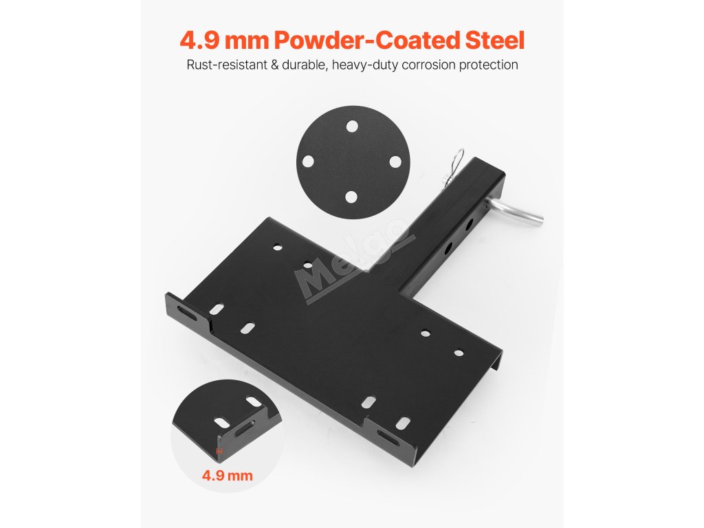 Tento držák na přívěsný vozík se snadno a rychle instaluje a je ideální pro montáž na přední i zadní část vozidla, čímž poskytuje pohodlí a všestrannost.