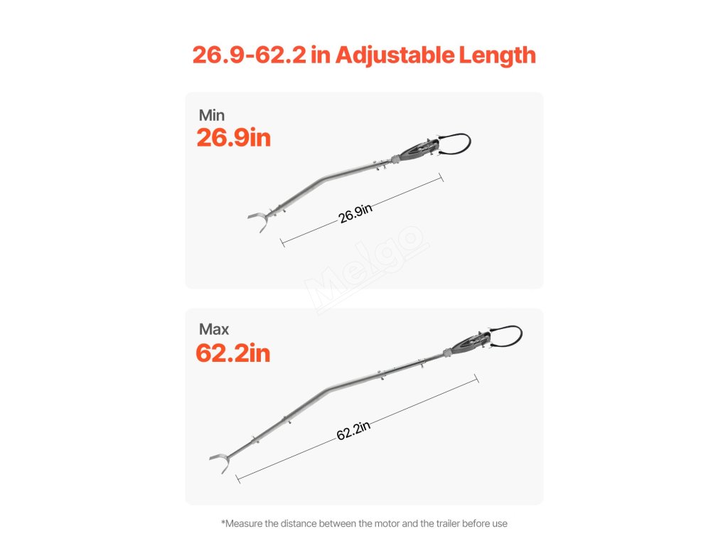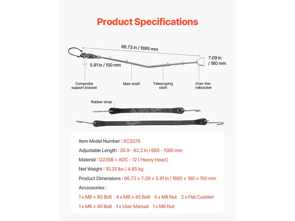 Náš záchranný systém s křížovým ramenem je určen pro motory s výkonem do 150 koní a má držák odolný proti korozi. Délka je nastavitelná od 26,9 do 62,2 palce. Poskytuje silnou oporu motoru při tažení, snižuje tlak na příčník lodi a pomáhá předcházet poškrábání a poškození.