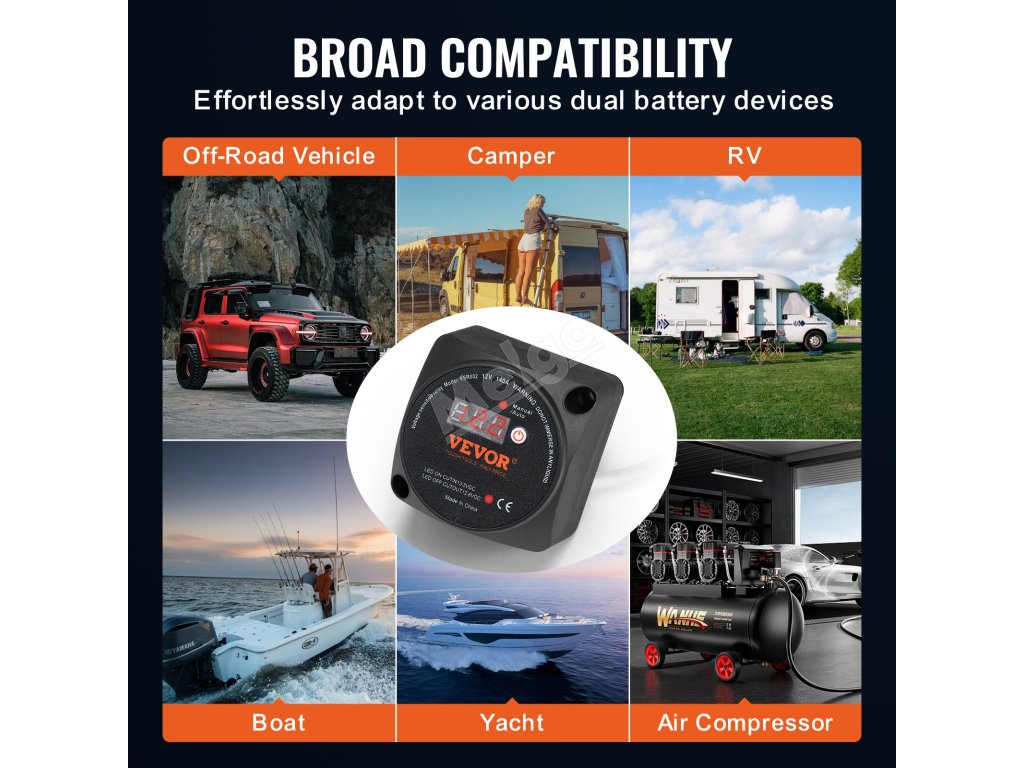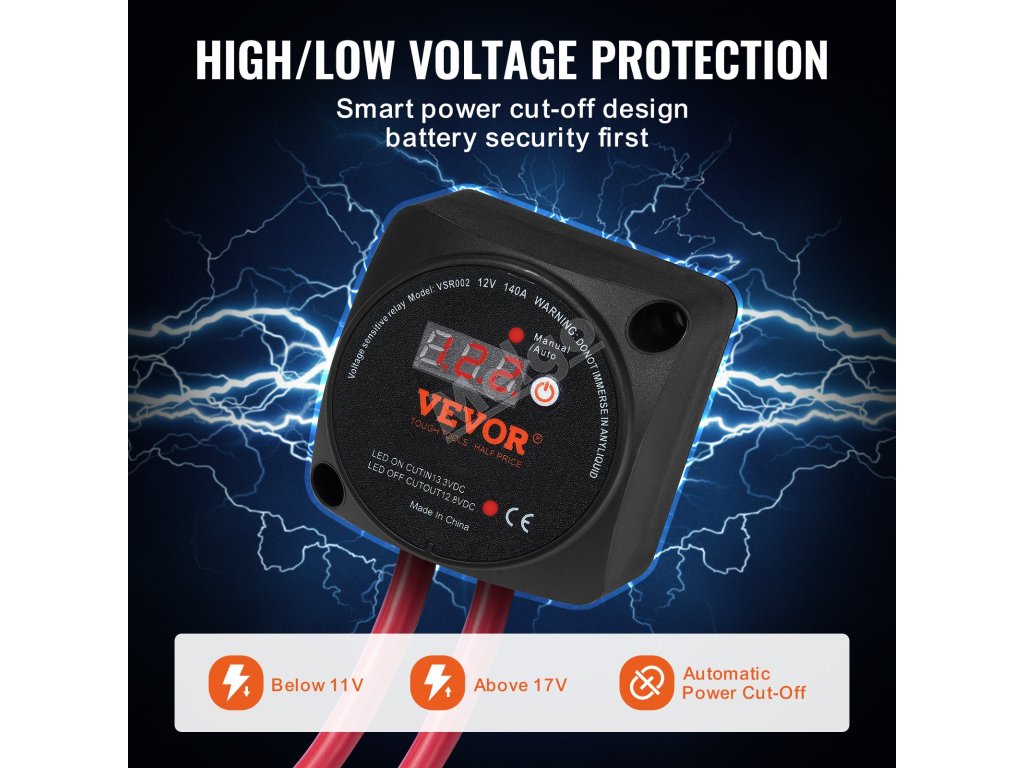Chraňte své baterie s bezkonkurenčním zabezpečením pomocí našeho chytrého izolátoru baterií s ochranou proti vysokému a nízkému napětí. Pokud je napětí nižší než 11 V nebo vyšší než 17 V, náš inteligentní systém okamžitě reaguje - automaticky odpojí obvod, aby se zabránilo poškození v důsledku nepravidelnosti napětí.