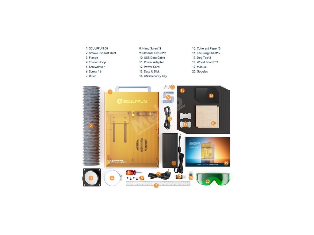 Obsah balení | 1 x Sculpfun G9 1 x obruč na krk 1 x příruba 1 x výfukové potrubí 1 x napájecí zdroj (adaptér*1+připojovací kabel*1) 1 x USB kabel 1 x bezpečnostní klíč USB 2 x svorka na materiál 2 x ruční šroub 1 x sada příslušenství (šroubovák*1+šrouby*6) 1 x U disk 1 x Návod k použití 1 x pravítko (300 mm) 5 x koherentní papír (210*210 mm) 1 x brýle 5 x ostřící list (86x54x0,2 mm) Bezplatné materiály: 2 x dřevěná deska 2 x psí známka |