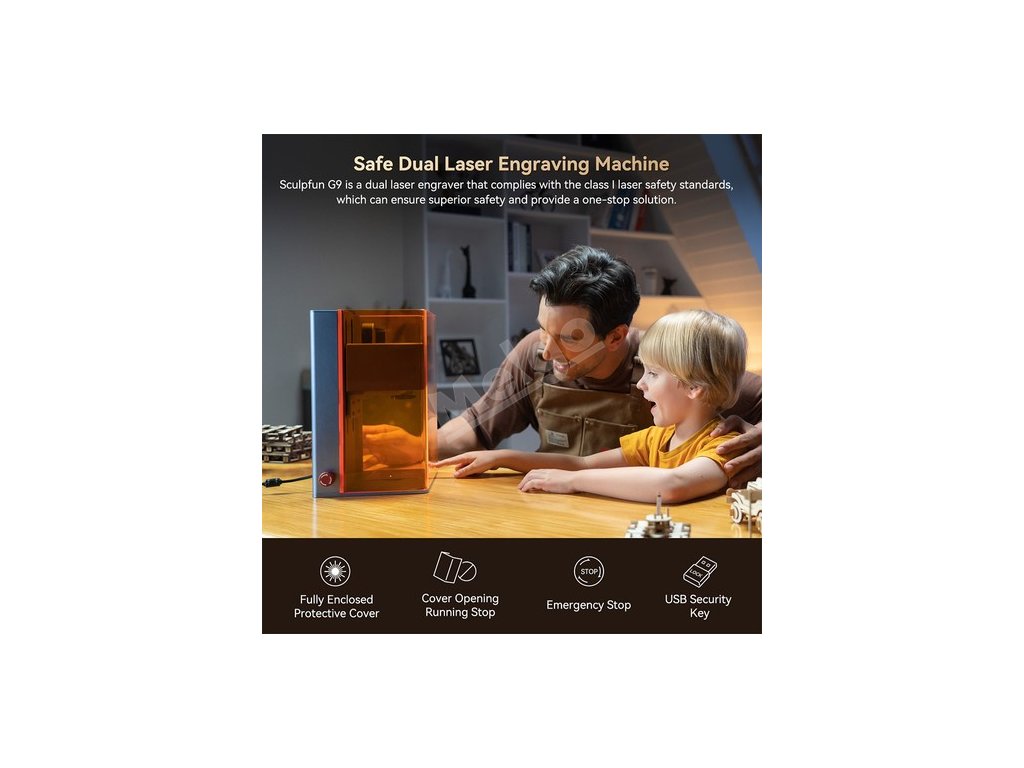 Sculpfun G9 je dvojitý laserový gravírovací stroj, který splňuje bezpečnostní normy laserové třídy I, čímž se vyhýbá většině bezpečnostních problémů a poskytuje komplexní řešení. Dodává se s ochranným krytem, takže není třeba kupovat další kryt nebo ochranné brýle, což vám zaručuje vynikající bezpečnost. Jeho používání je snadné a bezpečné, má vlastnosti uzavřeného pracovního prostoru a je předem smontován.