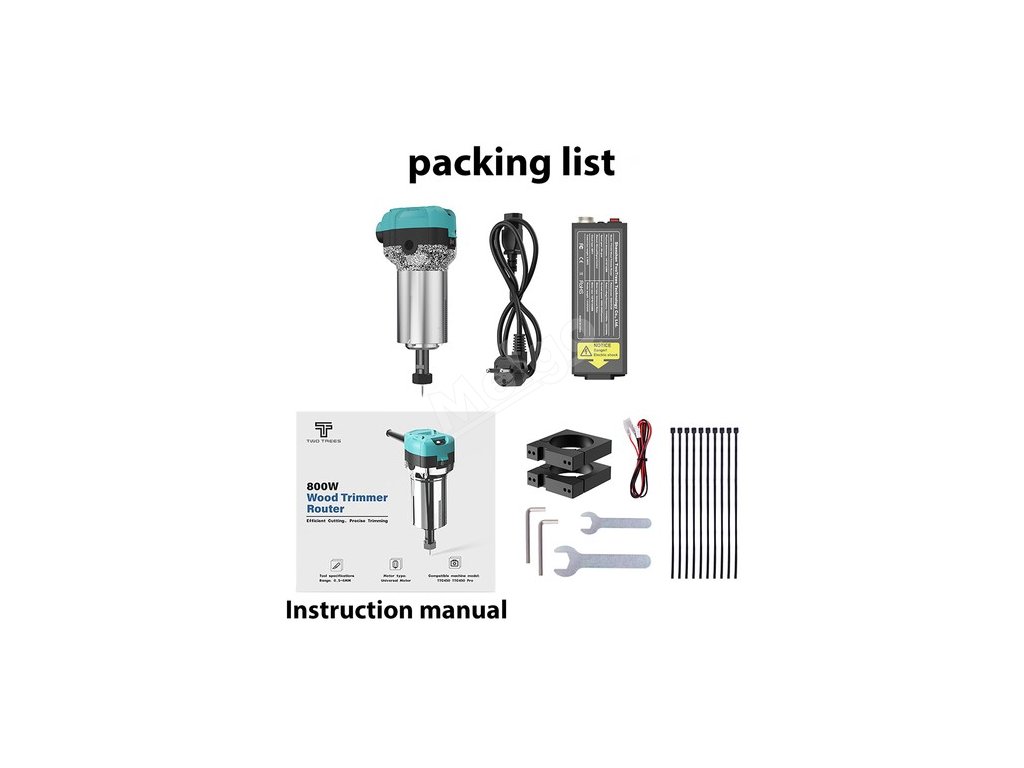 | Obecné | Štítek: TWO TREES Typ:Model:TREWES:Řezačka dřeva Model: TREWES: Frézka na dřevo: 800W Barva: Modrá |