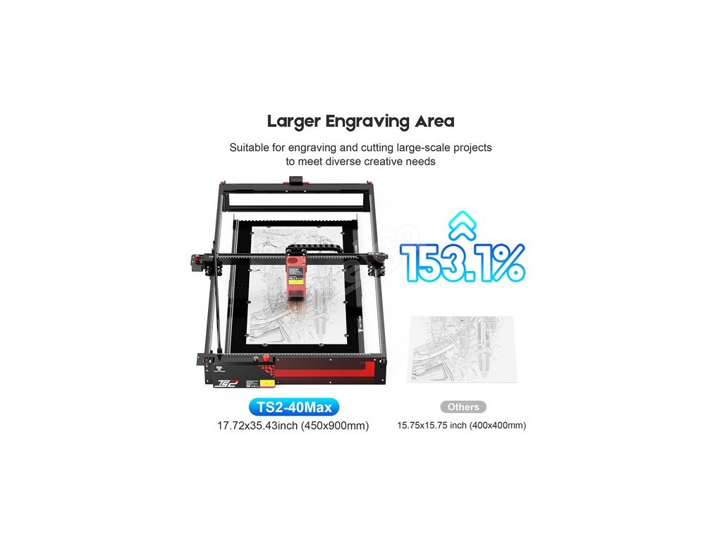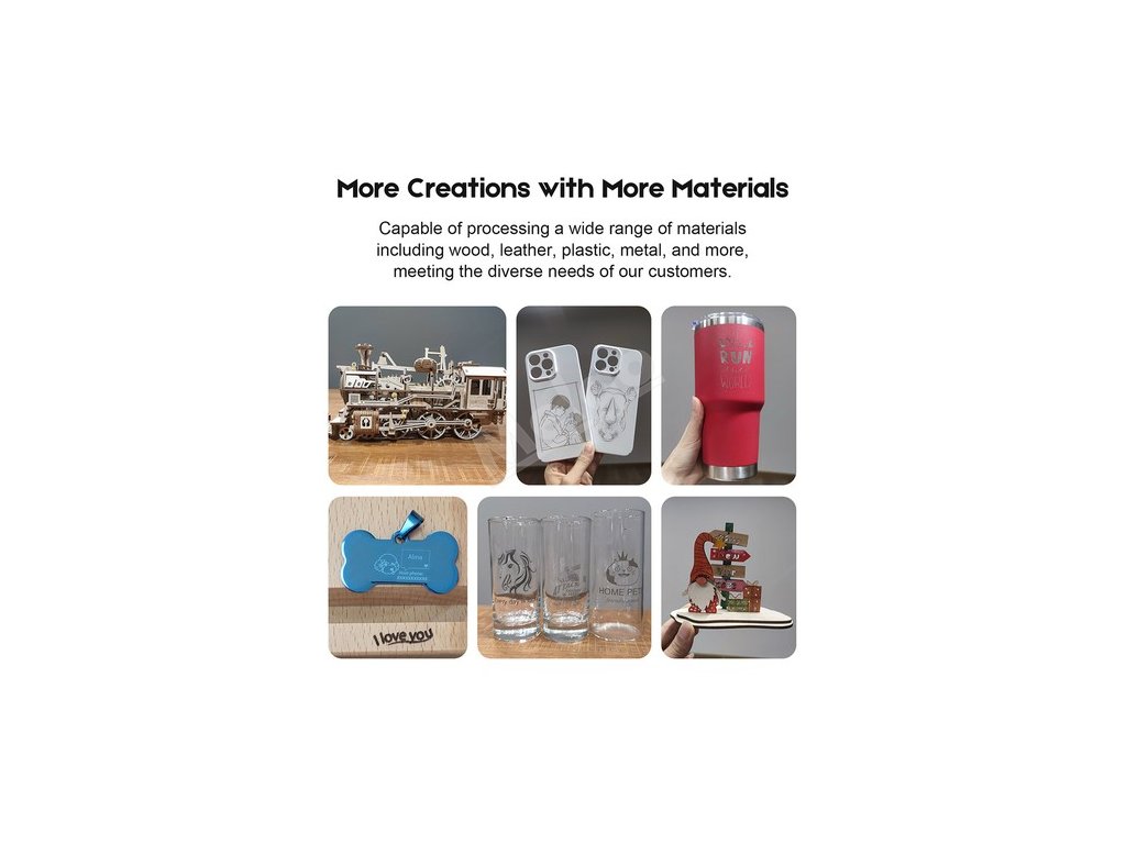40W vysoce výkonný laserový modul, který dokáže gravírovat/řezat různé materiály. Laserová gravírka Twotrees TS2-40Max dokáže gravírovat téměř všechny předměty včetně nerezové oceli, dřeva, akrylu, skla (s černým skleněným povrchem), keramiky, kamene, potravin, bambusu, plastu, kůže, lepenky a kulatých předmětů (je nutné použít další válečky). Dodejte svým návrhům kreativitu