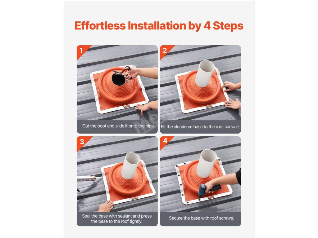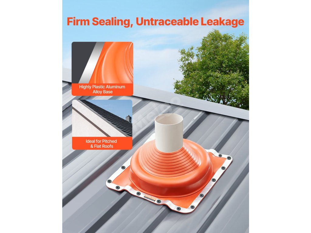 Obal na strešné rúry je vhodný pre rúry s priemerom od 6-3/4" do 14". Vďaka silikónovému krytu odolnému voči korózii odolá vysokým teplotám a nízkym mrazom. Pružná hliníková základňa uľahčuje rezanie a inštaláciu, zvládne rôzne strešné materiály a sklony. Odolné & tesné tesnenie, je to vaša ideálna voľba pre úniky strešných rúr.