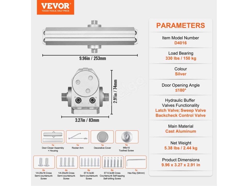 Dveřní zavírač, hydraulický nastavitelný do 150 kg, lité hliníkové