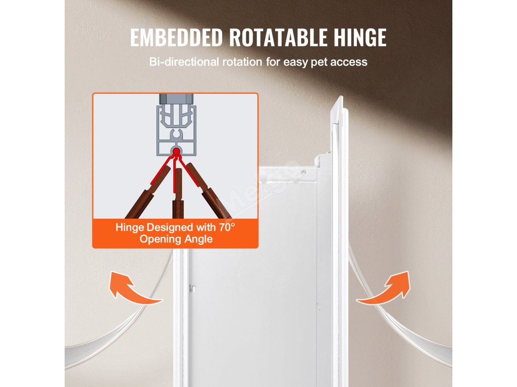 Jedinečná konstrukce závěsu umožňuje, aby se dvířka pro psy otáčela v širokém úhlu a váš mazlíček jimi mohl bez námahy projít. Magnetické těsnění se otevírá jemným zatlačením, což vašemu mazlíčkovi umožňuje snadný přístup a volný pohyb dovnitř i ven.
